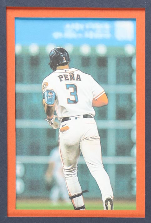 Custom frame measures approximately 34" x 42" in size and features a jersey that has been hand-signed by Jeremy Pena.