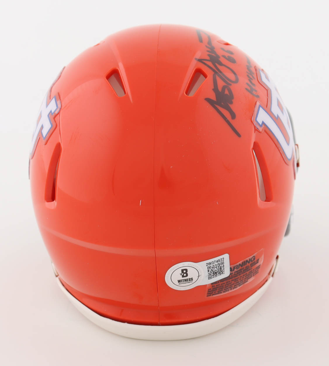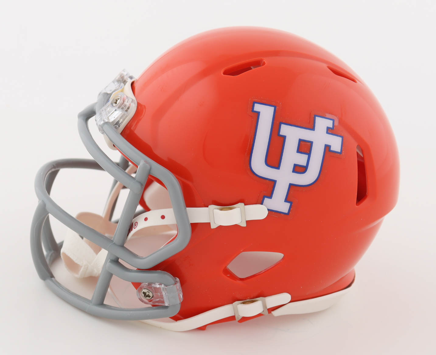 Riddell Heisman Trophy logo speed mini helmet. Hand-signed and inscribed by Steve Spurrier.