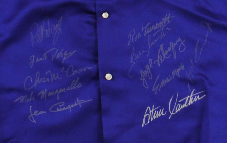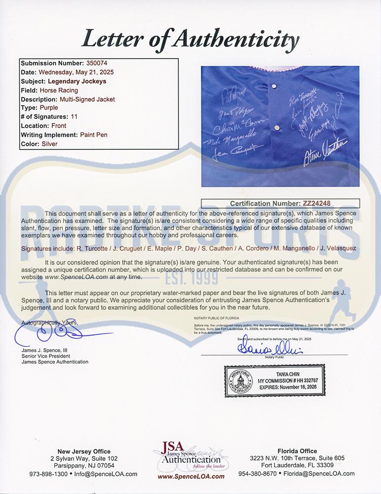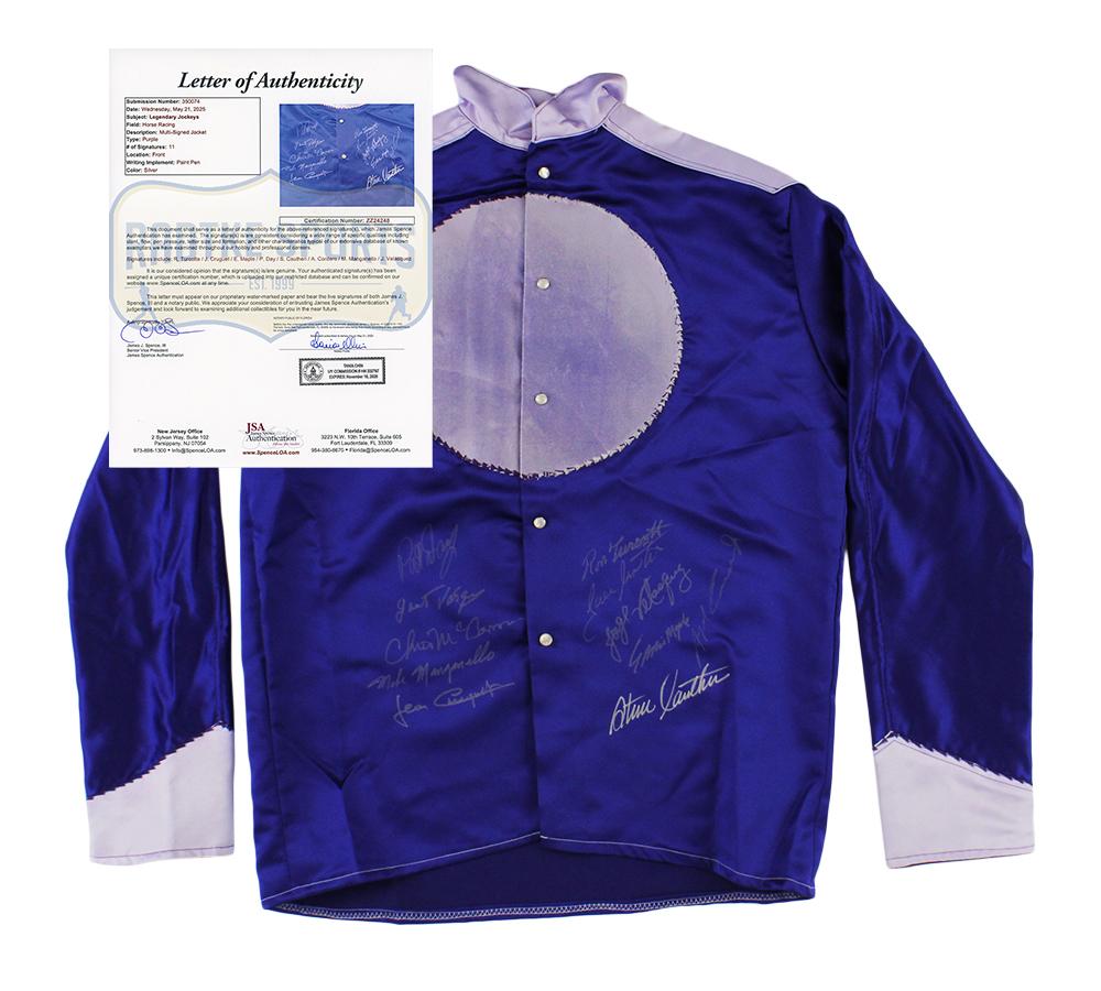 Jacket with everything sewn on, size XL. Hand-signed by (11) Triple Crown Winners including Ron Turcotte, Steve Cauthen, Jean Cruguet, and (8) others.
