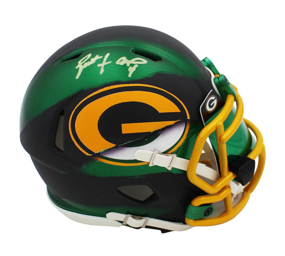 Riddell Green Bay Packers custom flash alternate speed mini helmet has been hand-signed by Brett Favre (HOF).
