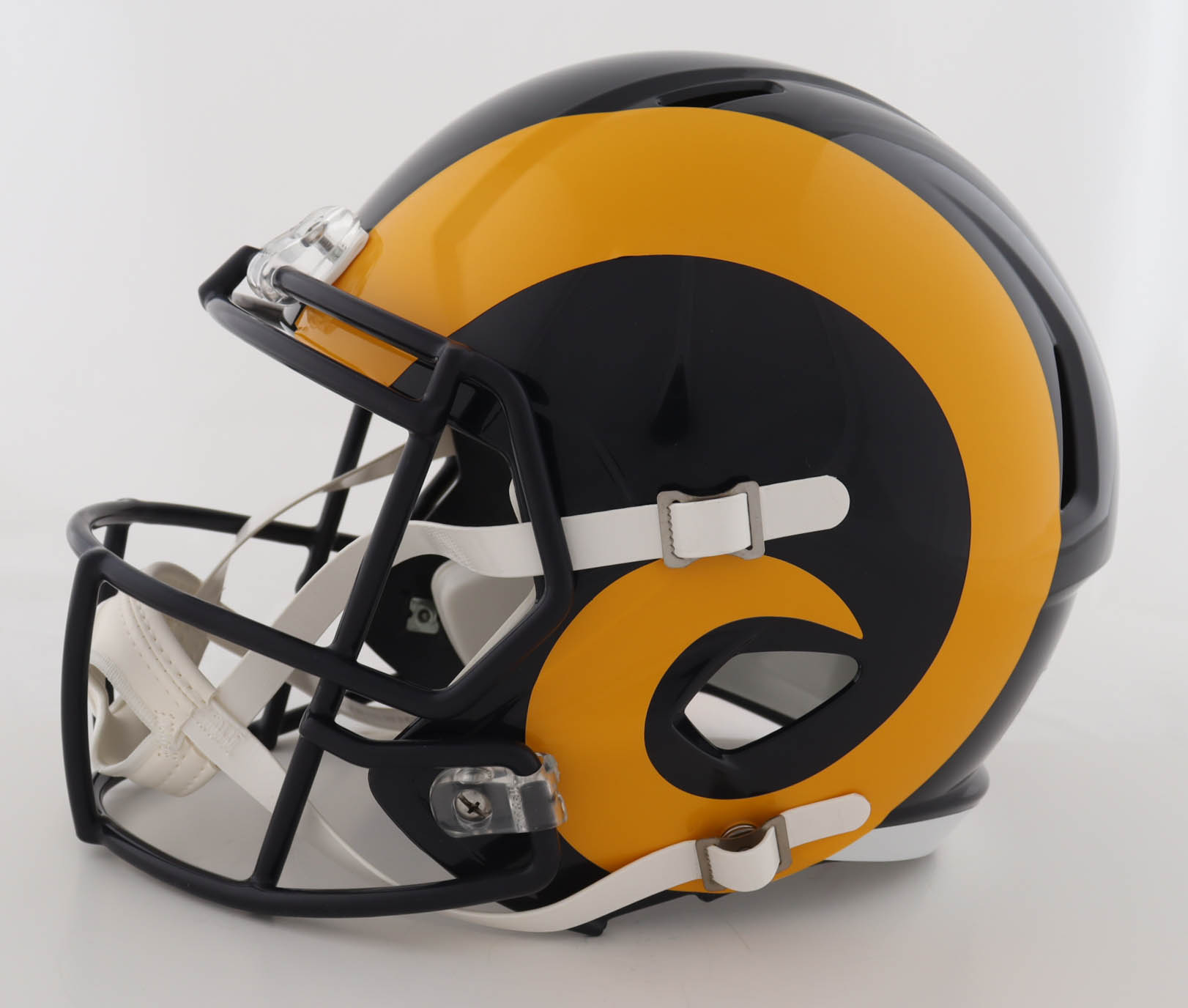 Riddell Los Angeles Rams full-size speed replica helmet has been hand-signed and inscribed by Jackie Slater (HOF).