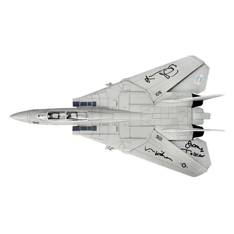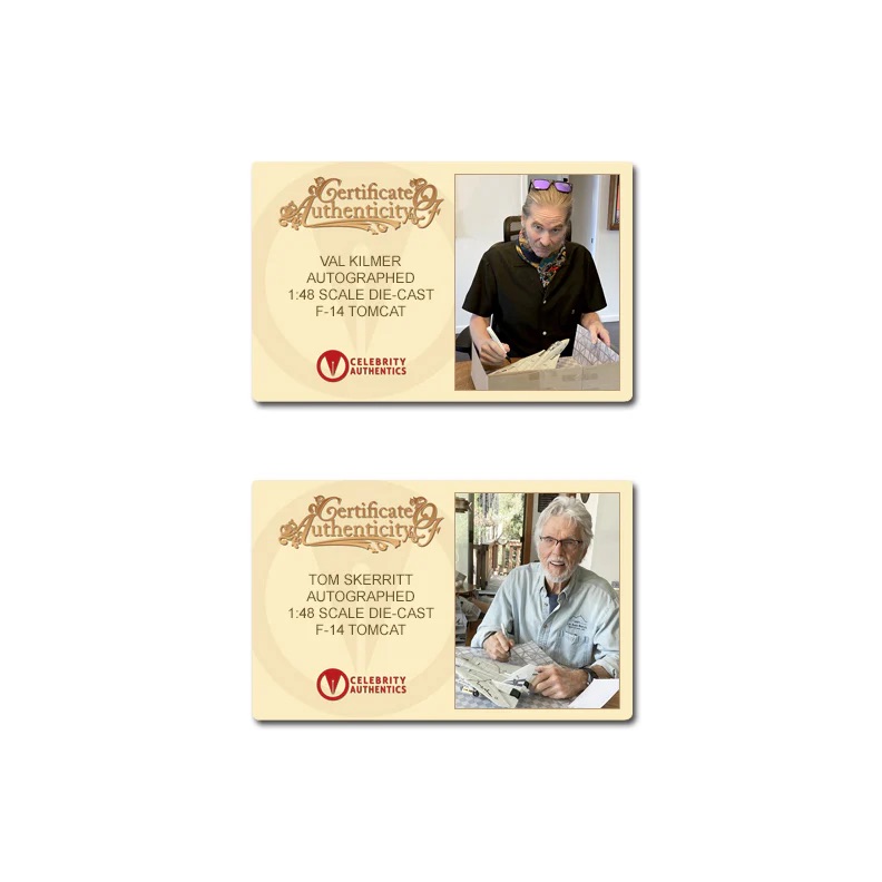 This Top Gun F-14 Die-Cast Tomcat 1:48 Scale Model has been personally hand-signed by Val Kilmer, Tom Skerritt, and James Tolkan during their signings with Celebrity Authentics.