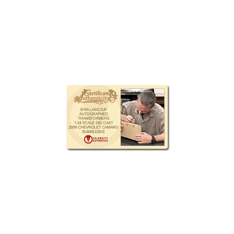 This rare 2006 Chevrolet Camaro 1:24 Scale Die-Cast Bumblebee has been personally autographed by Transformers star, Shia Labeouf during his signing with Celebrity Authentics.