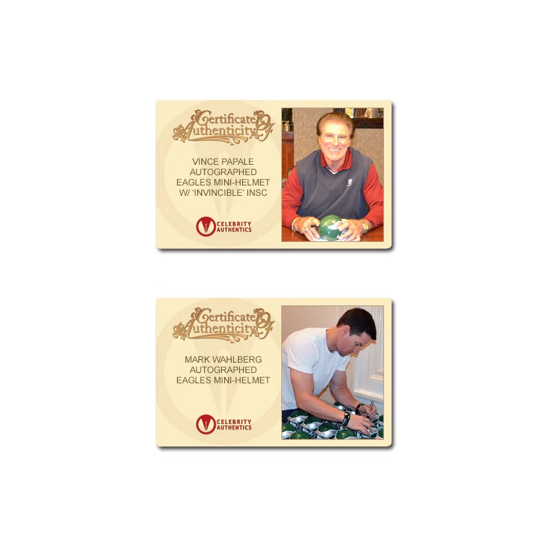 From the 2006 Invincible biopic film is this Philadelphia Eagles Mini-Helmet Helmet personally hand-signed by film star Mark Wahlberg and the man who portrayed, Vince Papale during their signings with Celebrity Authentics.