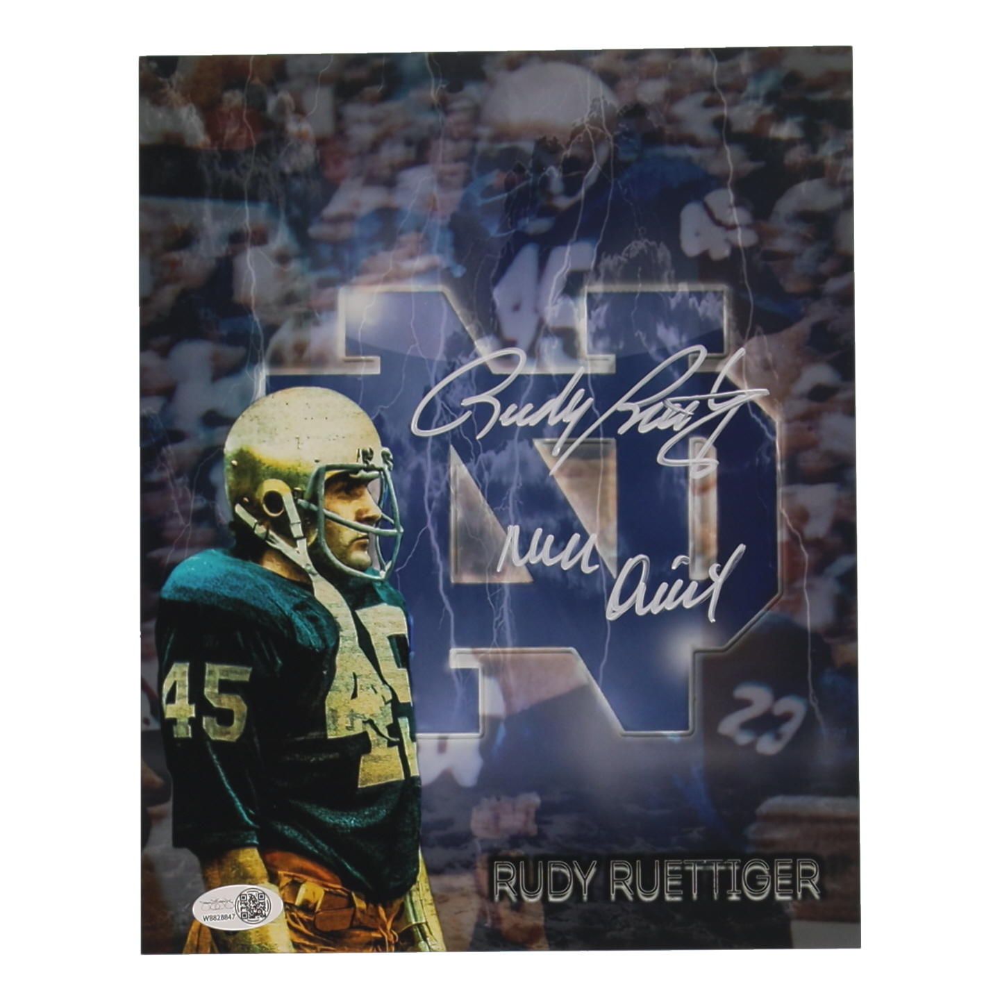 Photo measures 8" x 10" in size and has been hand-signed and inscribed by Rudy Ruettiger.