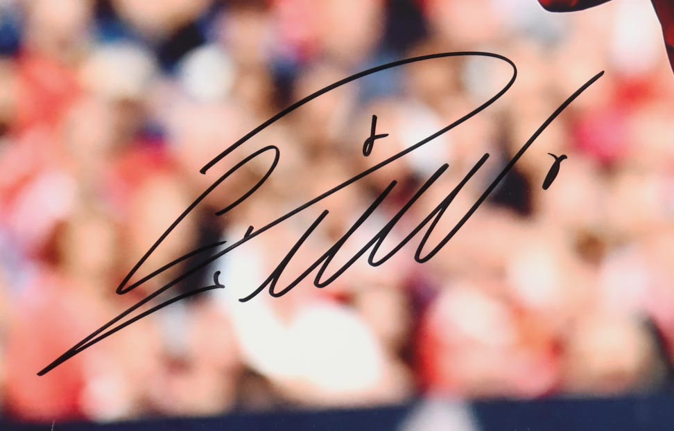 The autograph includes an official Beckett Authentication Services serially numbered hologram as well as an official SportsMemorabilia.com hologram for authenticity purposes. The signing of this item was witnessed by Beckett.
