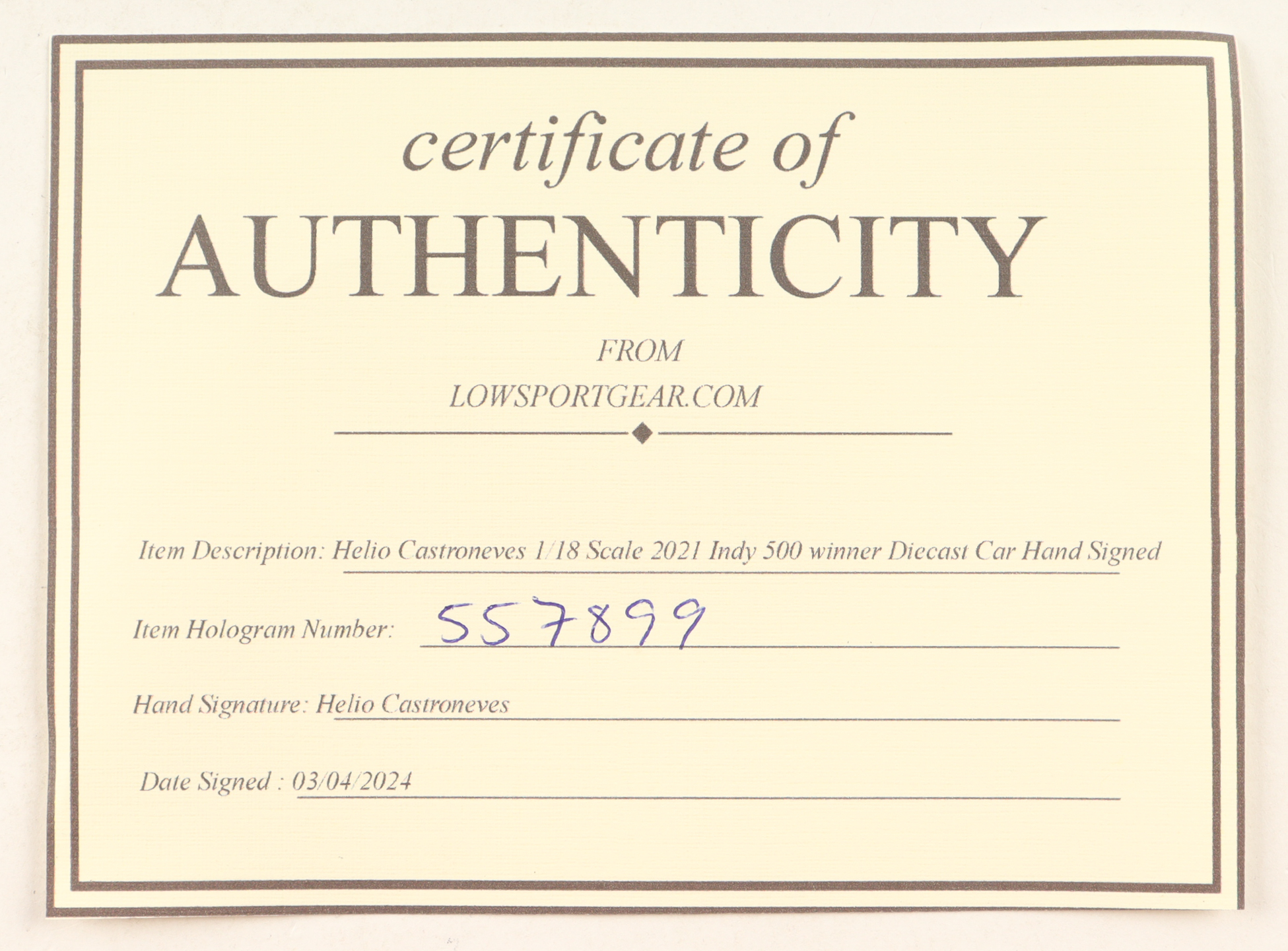 May 30, 2021 Indianapolis 500 1/ 18 Scale Diecast car has been hand-signed byk Helio Castroneves.