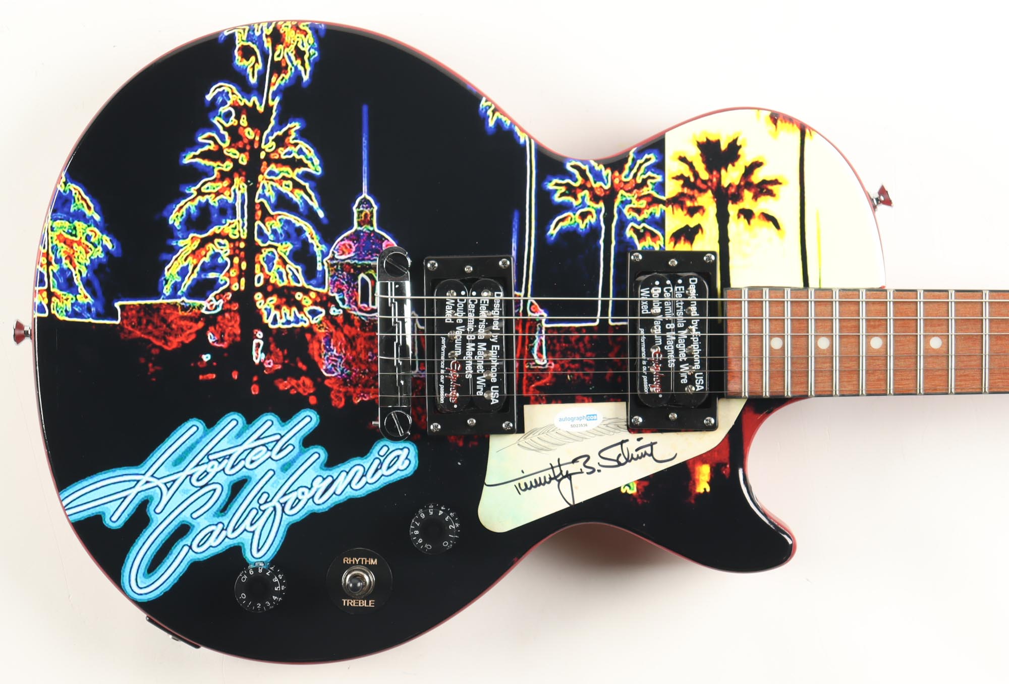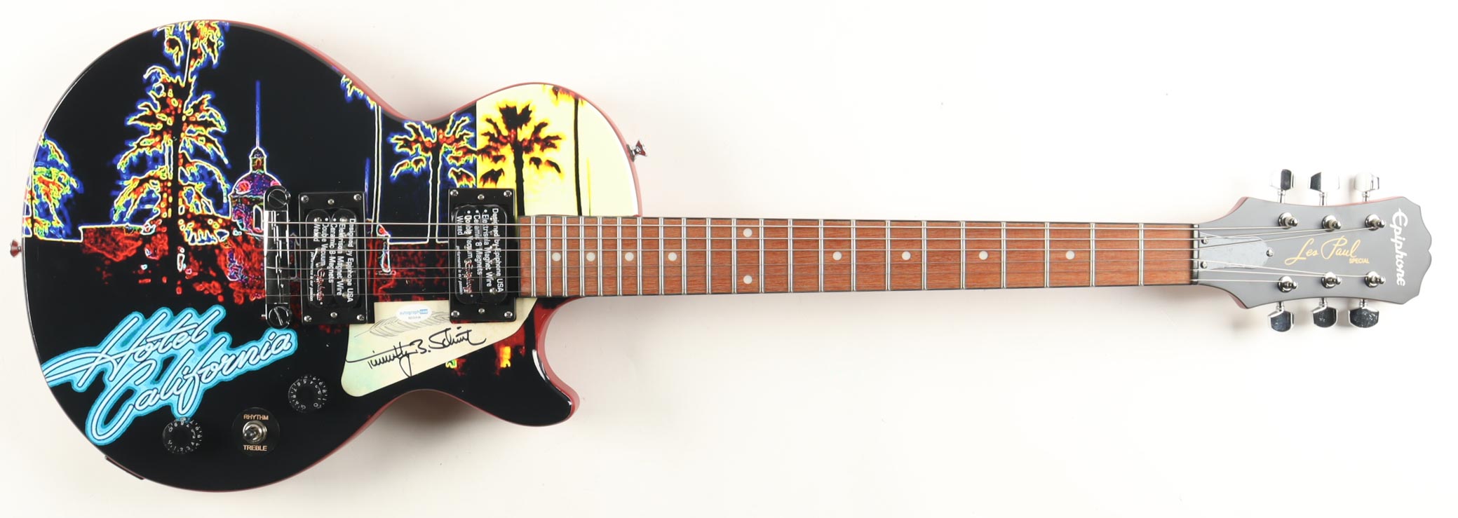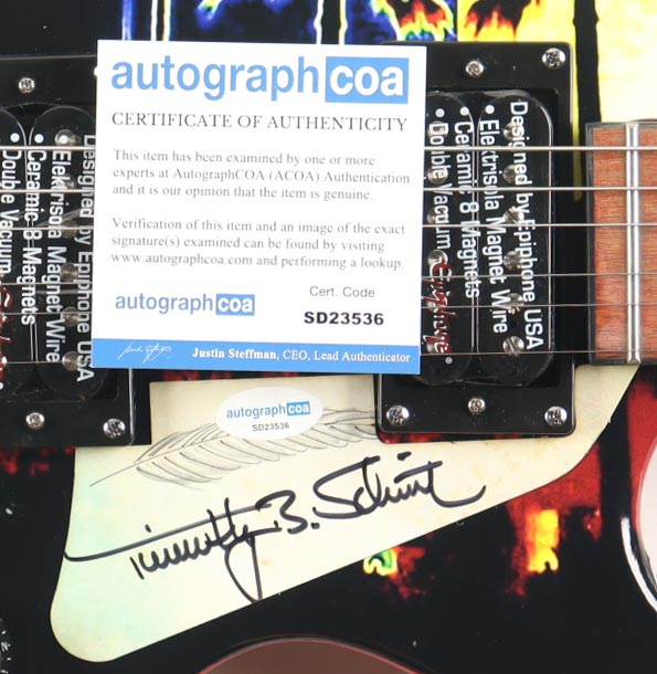 Epiphone Les Paul edition custom electric guitar measures 39" has been hand-signed on the pick-guard by Timothy B. Schmit.