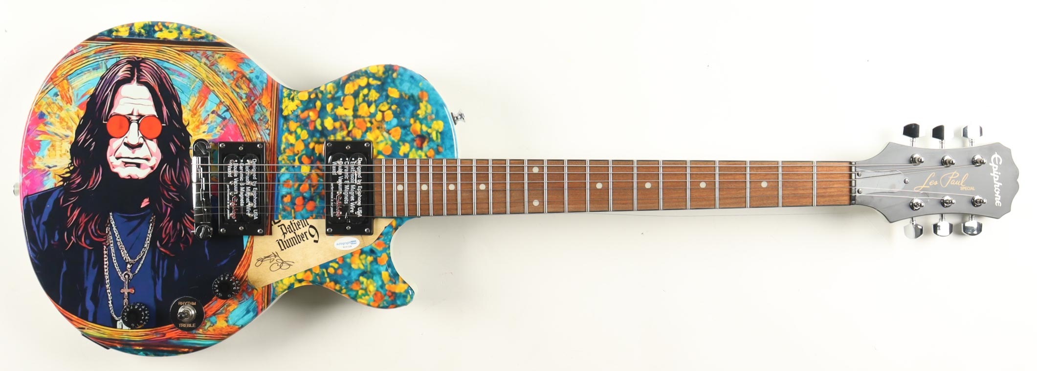 Epiphone Les Paul edition custom electric guitar measures 39" has been hand-signed on the pick-guard by Ozzy Osbourne.