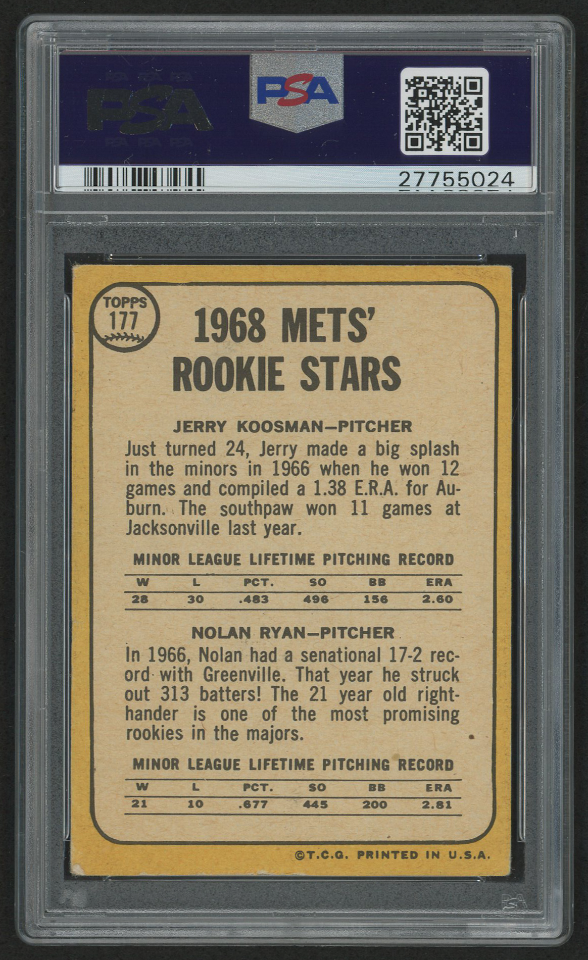 1968 Topps #177 Rookie Stars/Jerry Koosman RC/Nolan Ryan RC has been hand-signed in blue felt-tip pen by Nolan Ryan (Astros, HOF). Please see scans for details regarding the condition of the card.