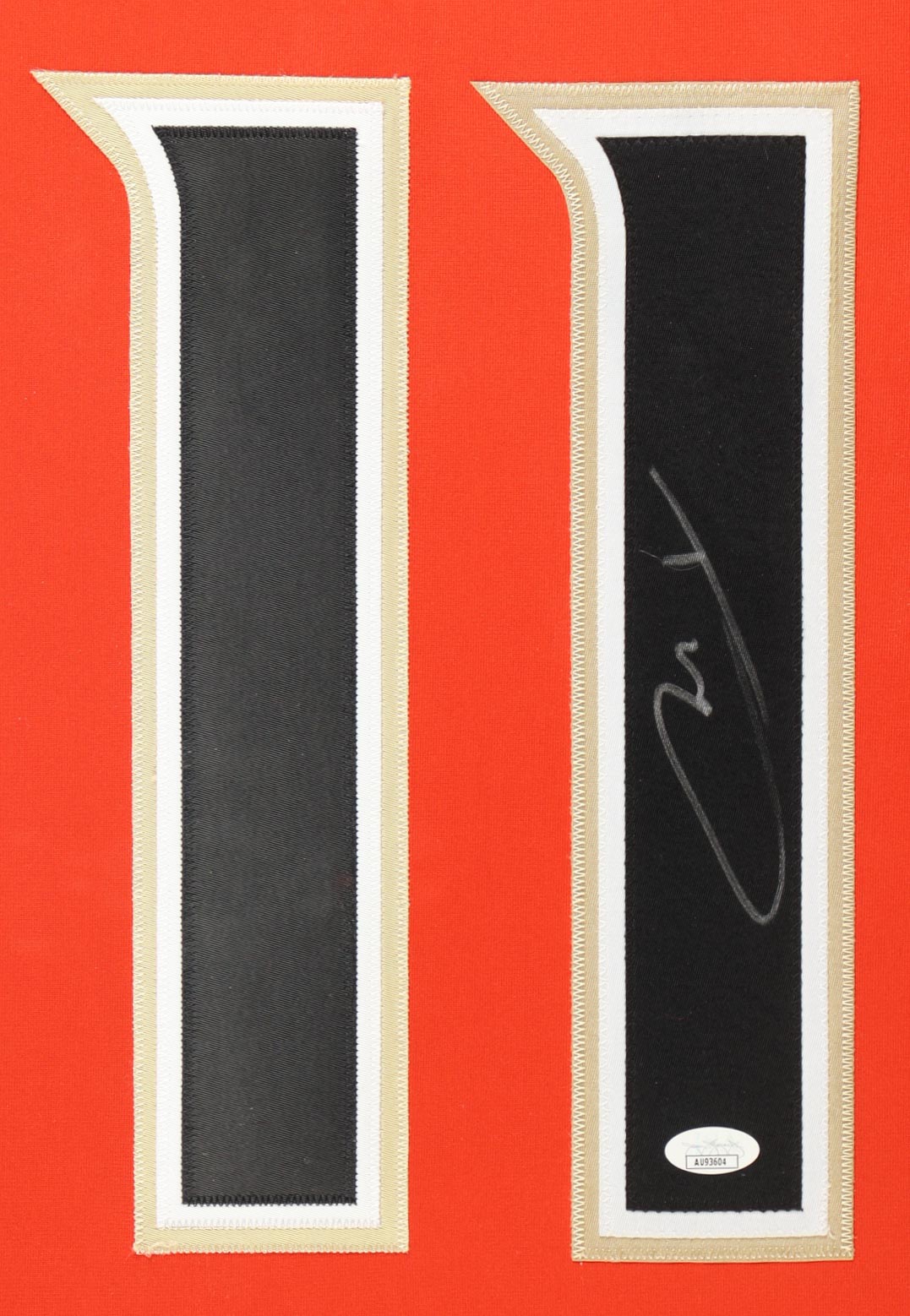 Custom frame measures approximately 34" x 42" in size and features a jersey that has been hand-signed by Trevor Zegras.