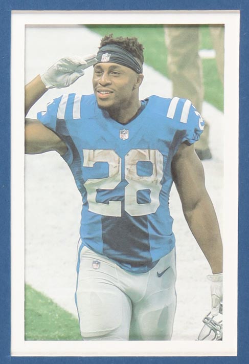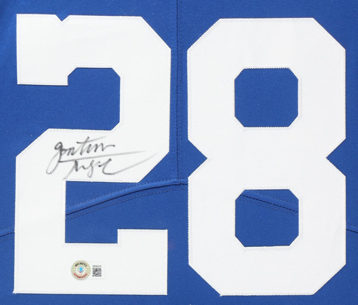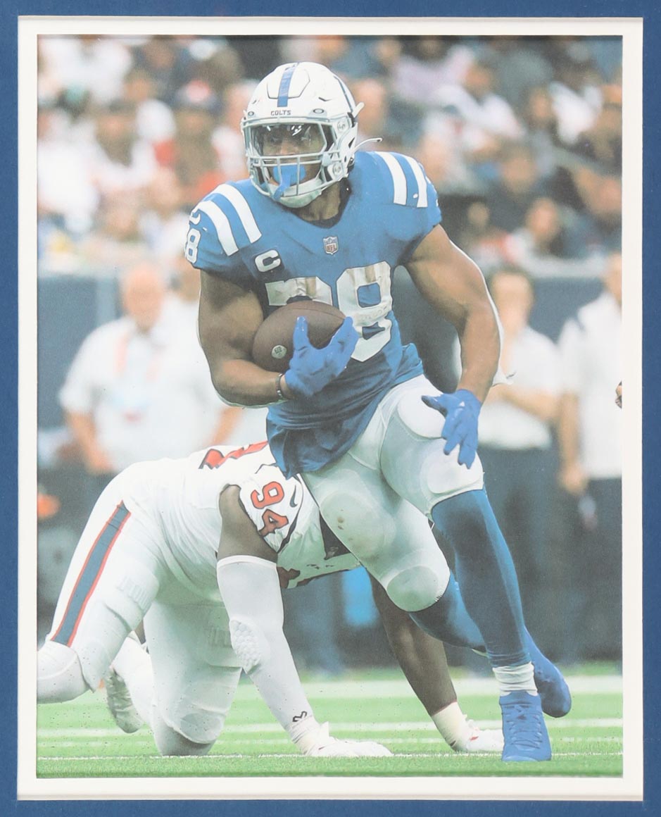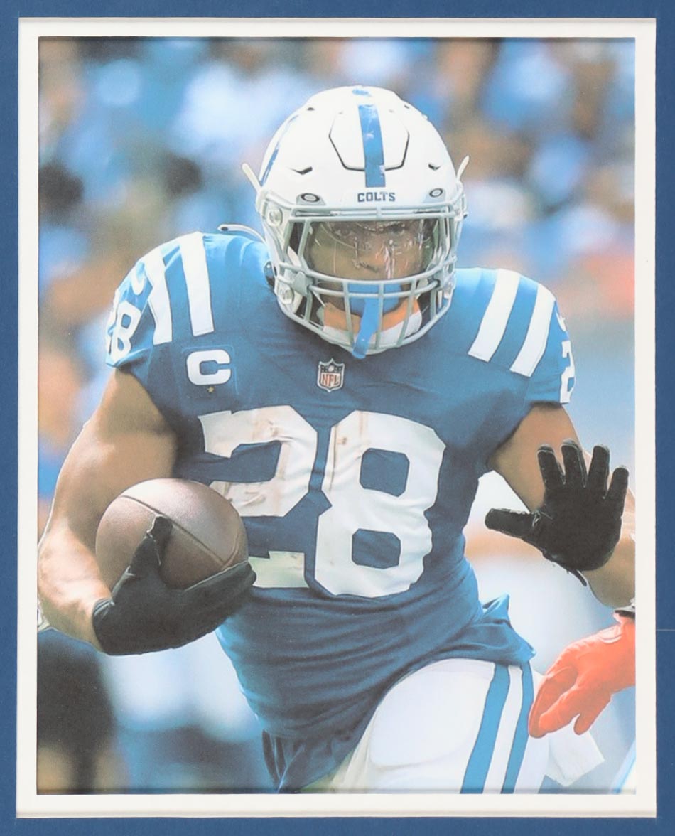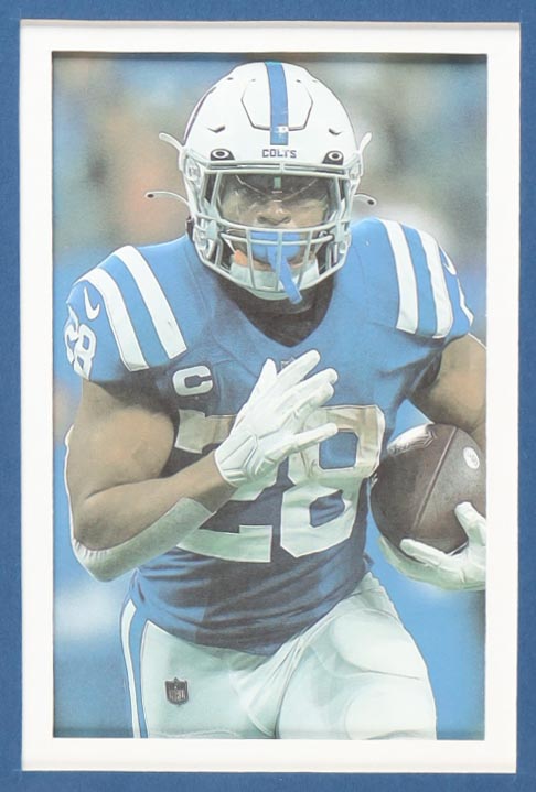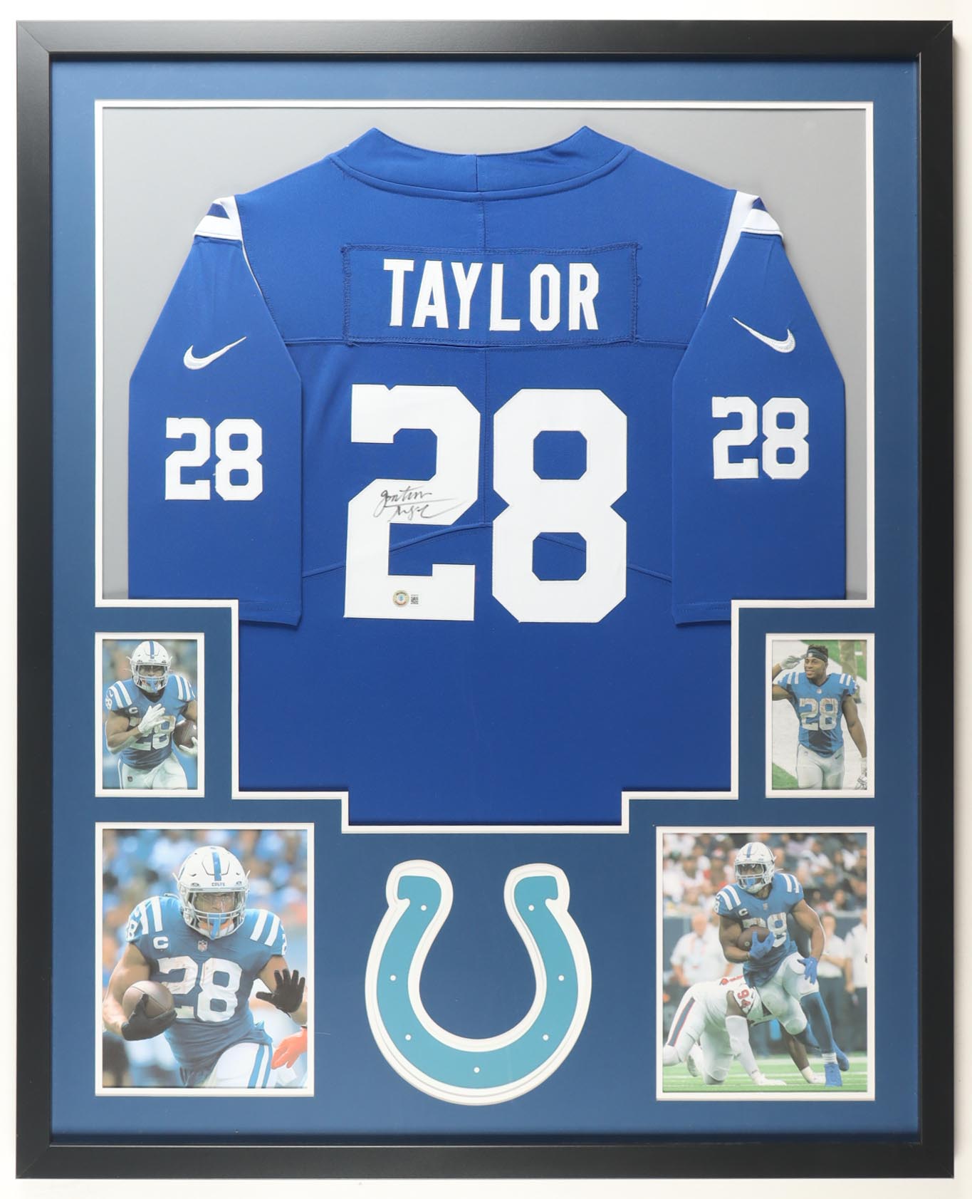 Custom frame measures approximately 34" x 42" in size and features a jersey that has been hand-signed by Jonathan Taylor.