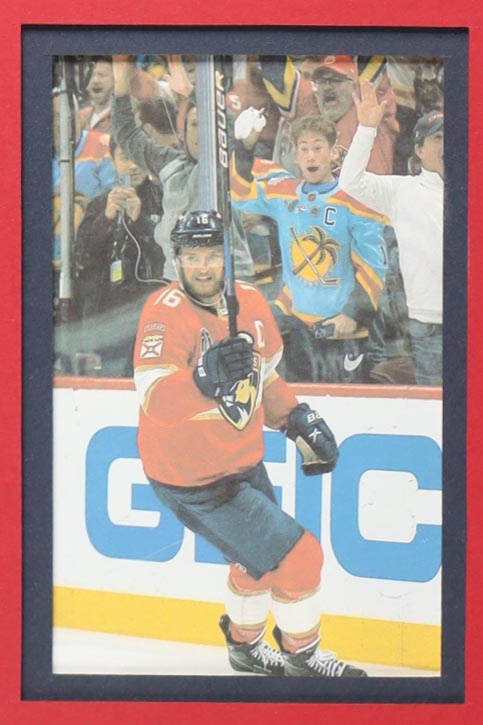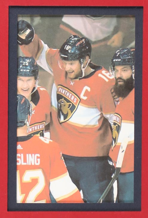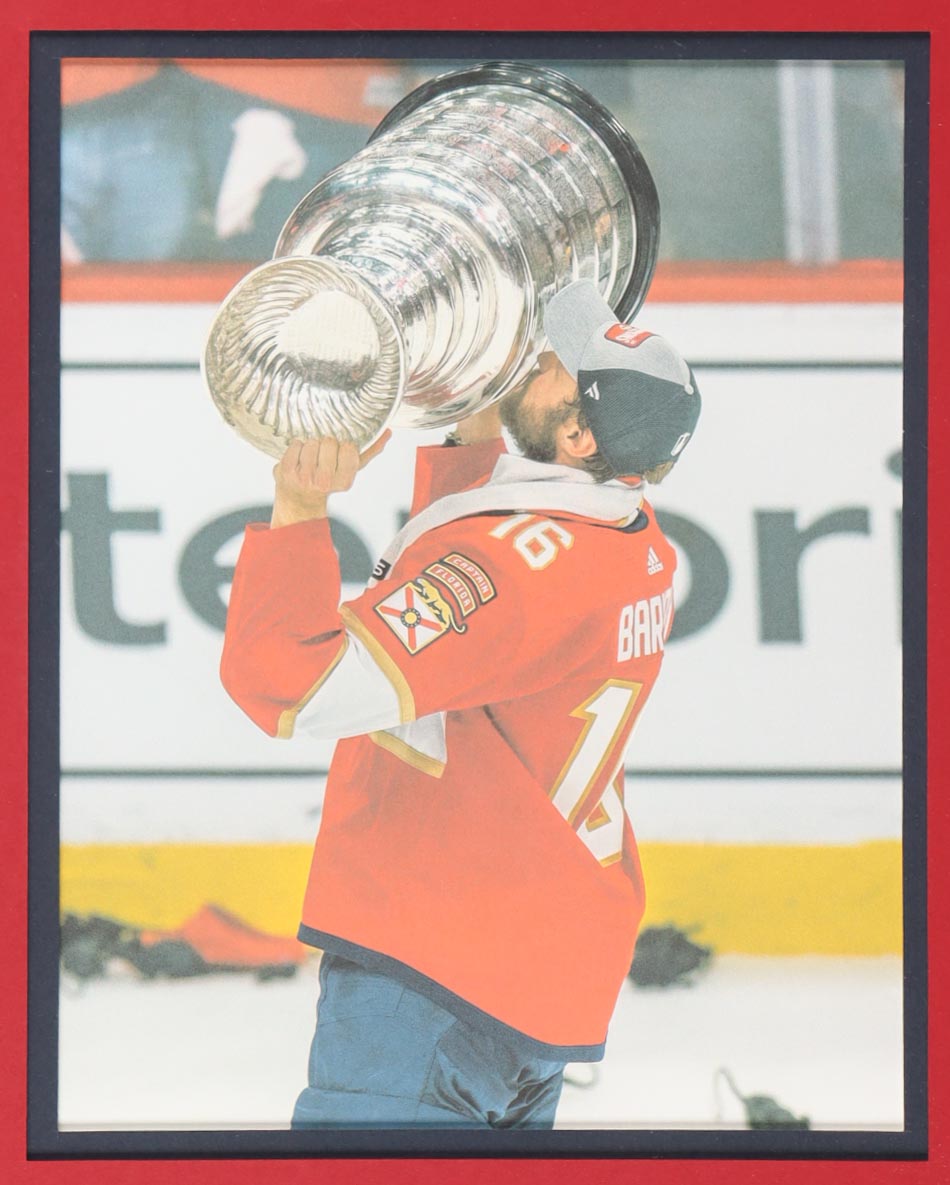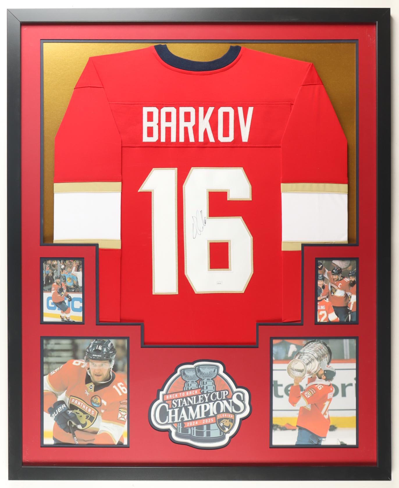 Custom frame measures approximately 34" x 42" in size. Features a jersey that has been hand-signed by Aleksander Barkov.