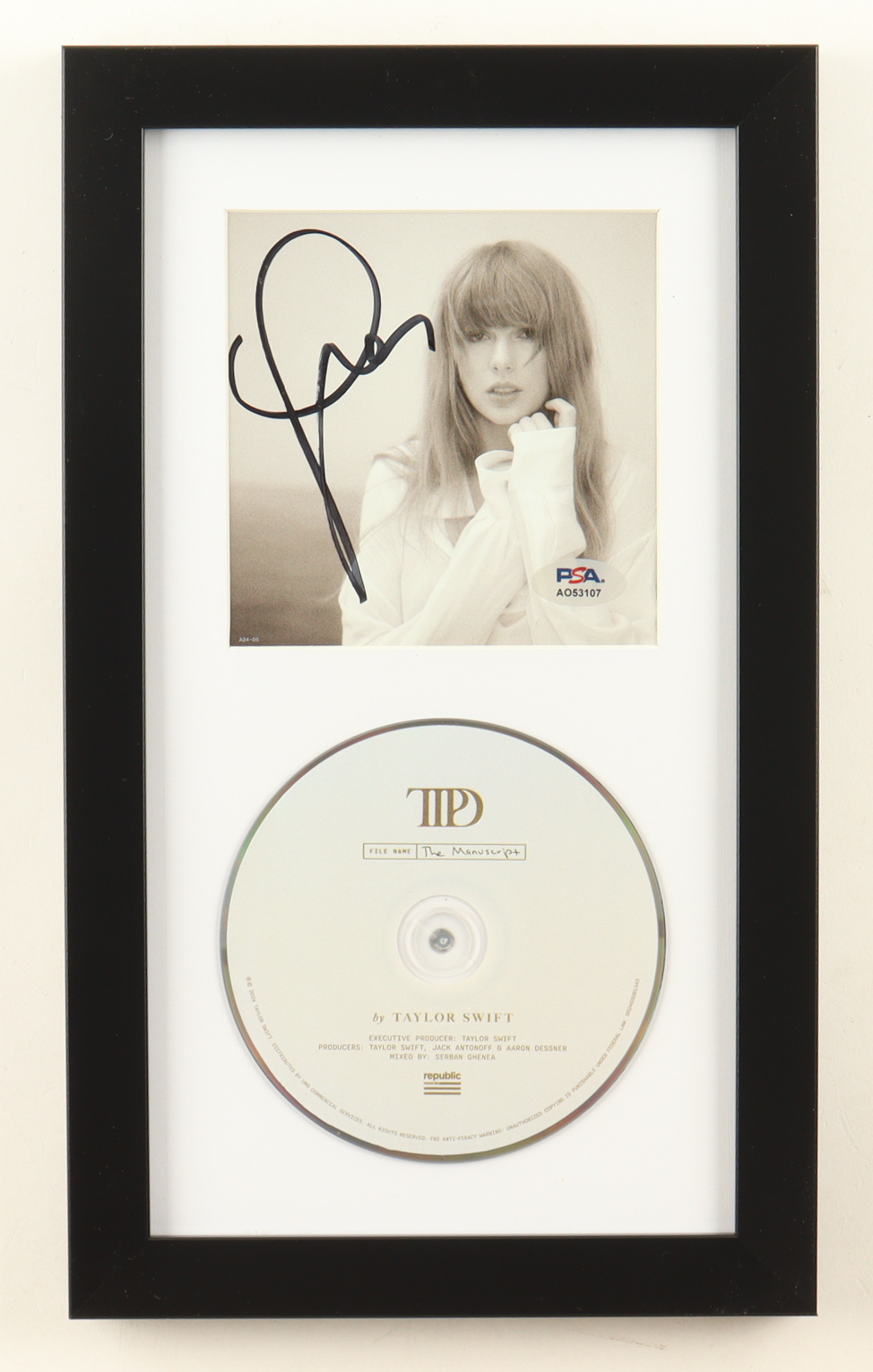 Custom frame measures approximately 8" x 13.5" in size. Features a "The Torture Poets Department" CD insert that has been hand-signed by Taylor Swift. The display also includes the disc as shown.