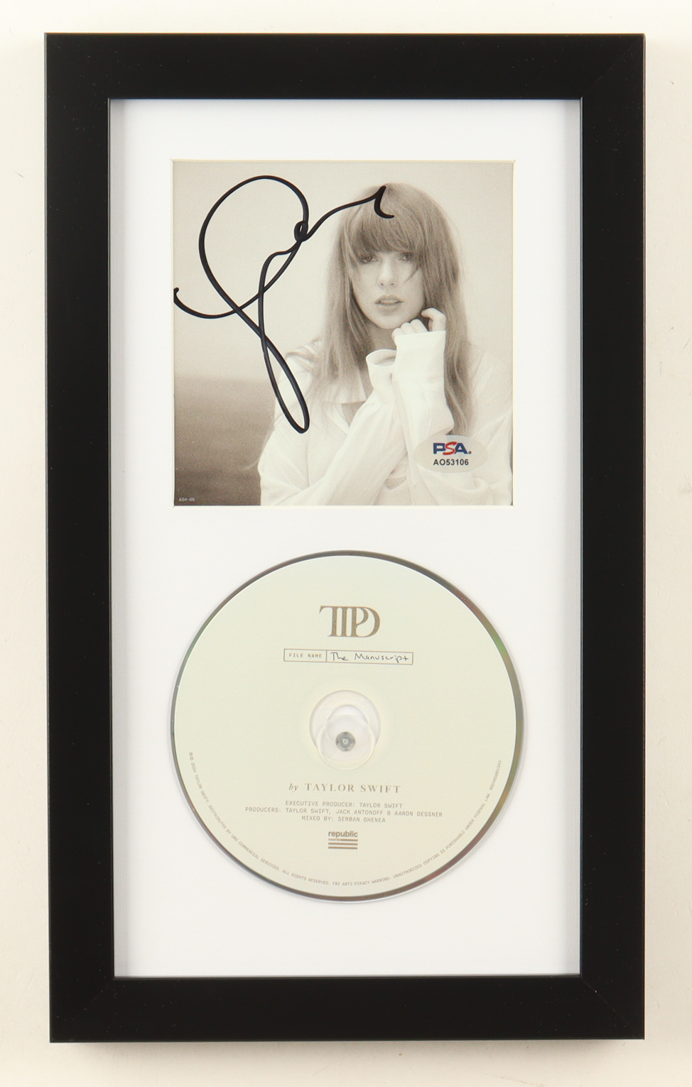 Custom frame measures approximately 8" x 13.5" in size. Features a "The Torture Poets Department" CD insert that has been hand-signed by Taylor Swift. The display also includes the disc as shown.