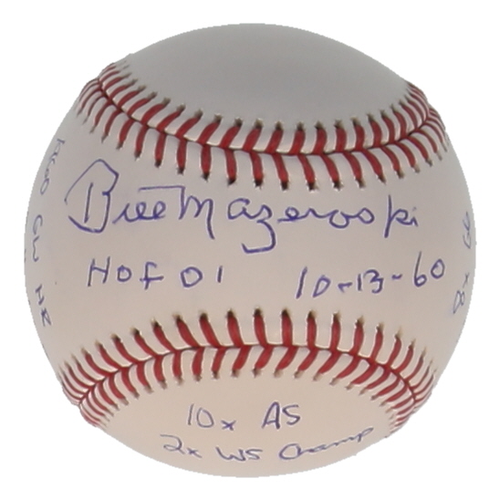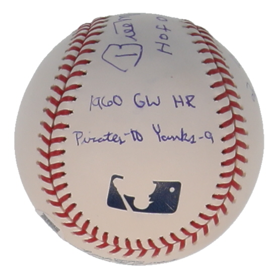 Rawlings Official Major League Baseball. Hand-signed and inscribed by Bill Mazeroski (Pittsburgh Pirates, HOF). Please note, there are minor stains throughout the baseball.
