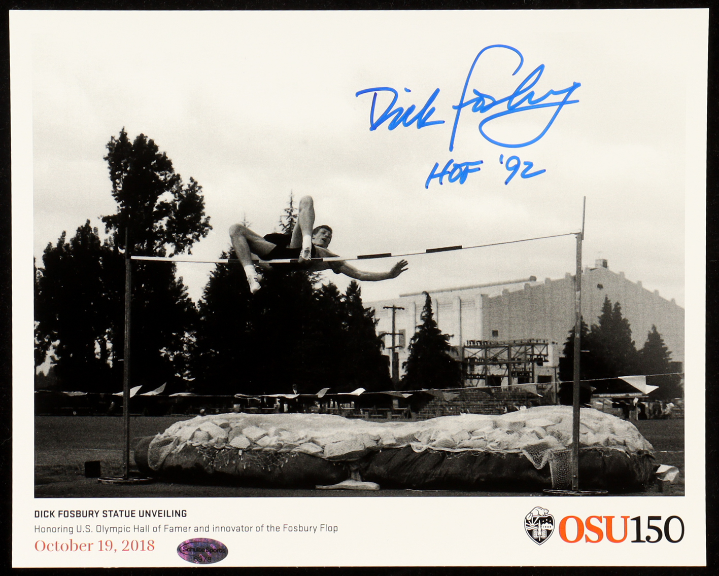 Photo measures 8" x 10" in size. Hand-signed and inscribed by Dick Fosbury (D. 2023, HOF).