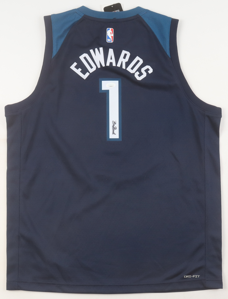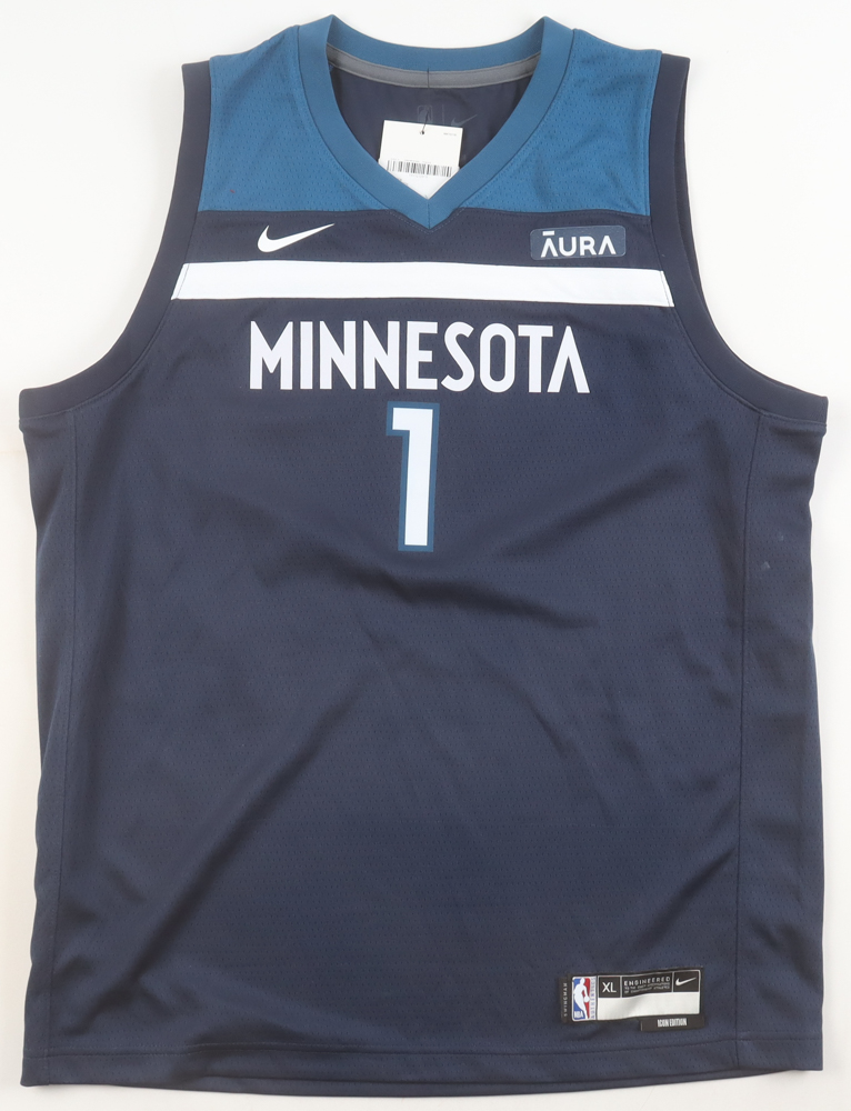 Nike authentic jersey with everything pressed on, size XL. Hand-signed by Anthony Edwards.