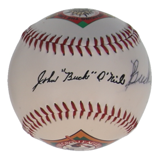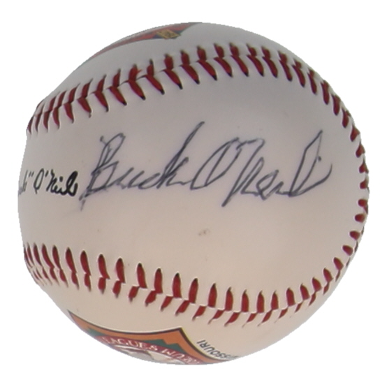 Fotoball 50th Anniversary Commemorative Logo Baseball. Hand-signed by Buck O'Neil (D. 2006, Kansas City Monarchs, HOF). Please note, there are stains throughout the baseball.