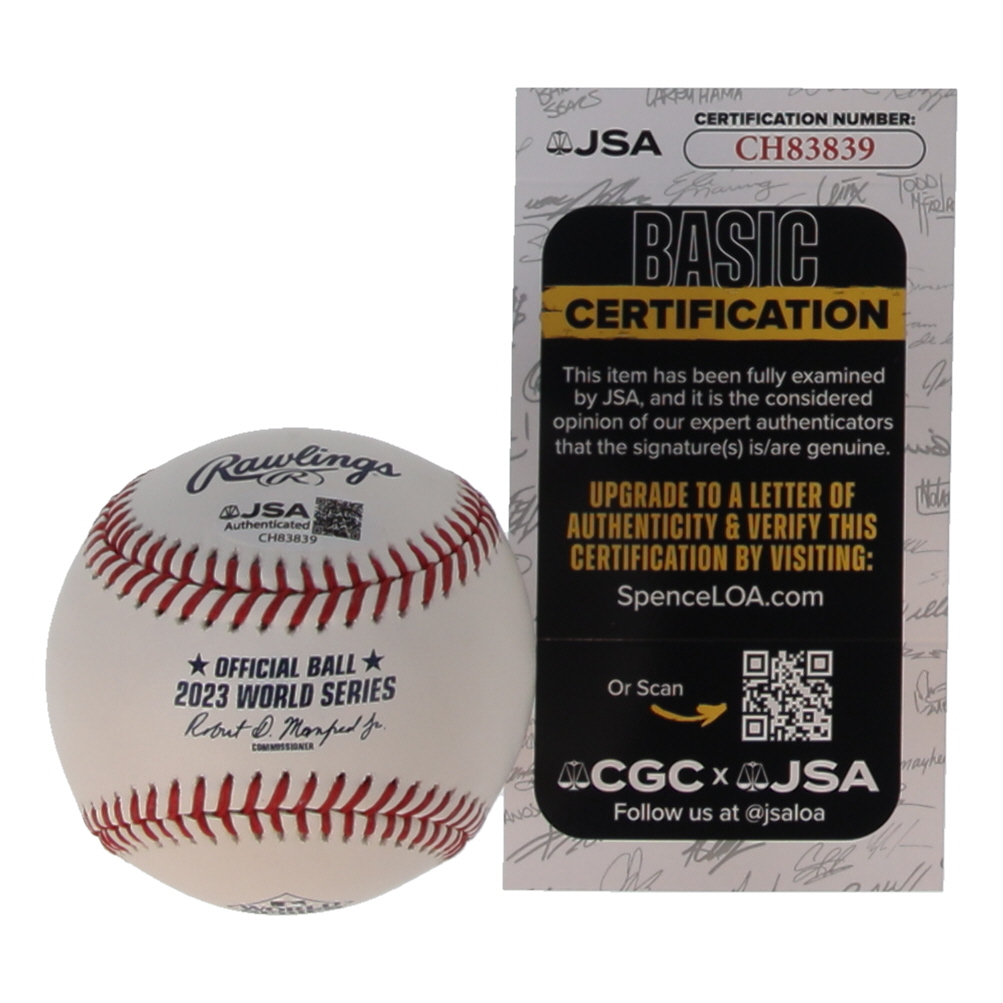 Rawlings Official 2023 World Series Baseball. Hand-signed and inscribed by Jon Gray (Texas Rangers). Please note, there are minor stains throughout the baseball.