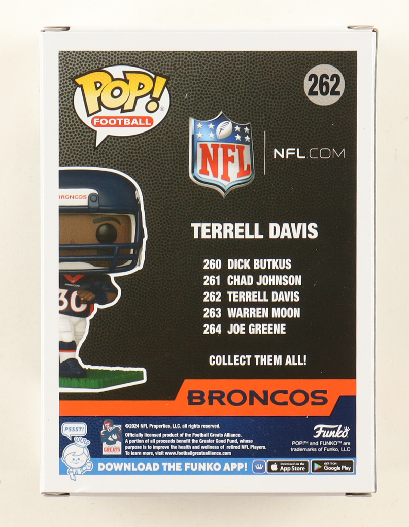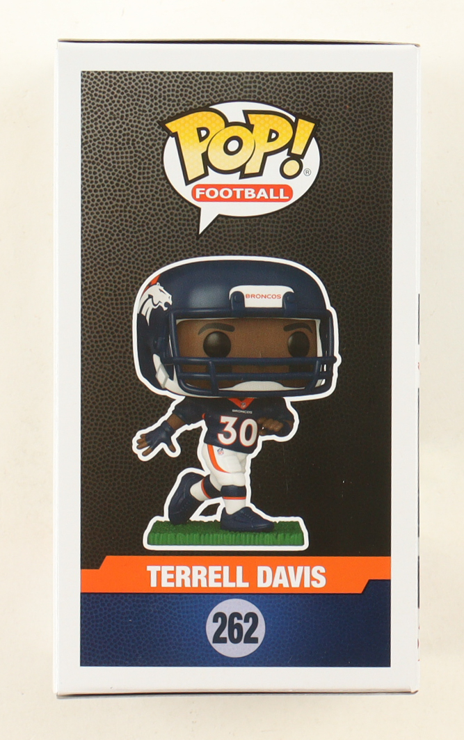 Funko Pop! vinyl figure measures approximately 4" in height. Hand-signed by Terrell Davis (Denver Broncos). Please note the window has been swapped and there is damage to the bottom of the packaging.