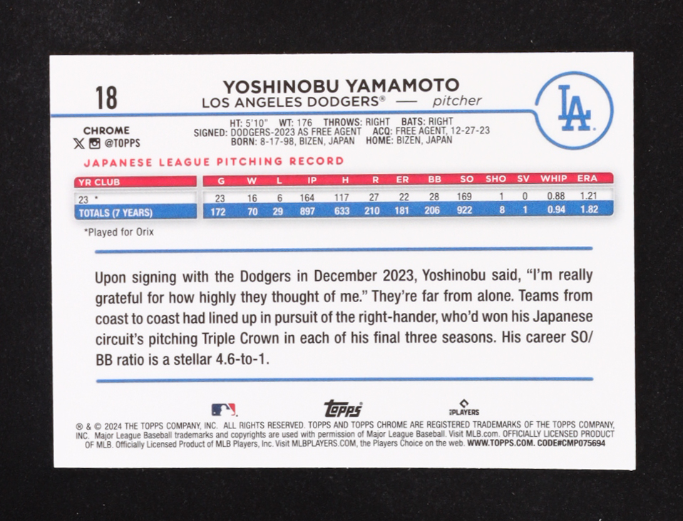 Yoshinobu Yamamoto 2024 Topps Chrome Pink Refractor #18 RC