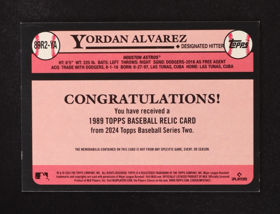 Yordan Alvarez 2024 Topps '89 Topps Relics #89R2YA S2