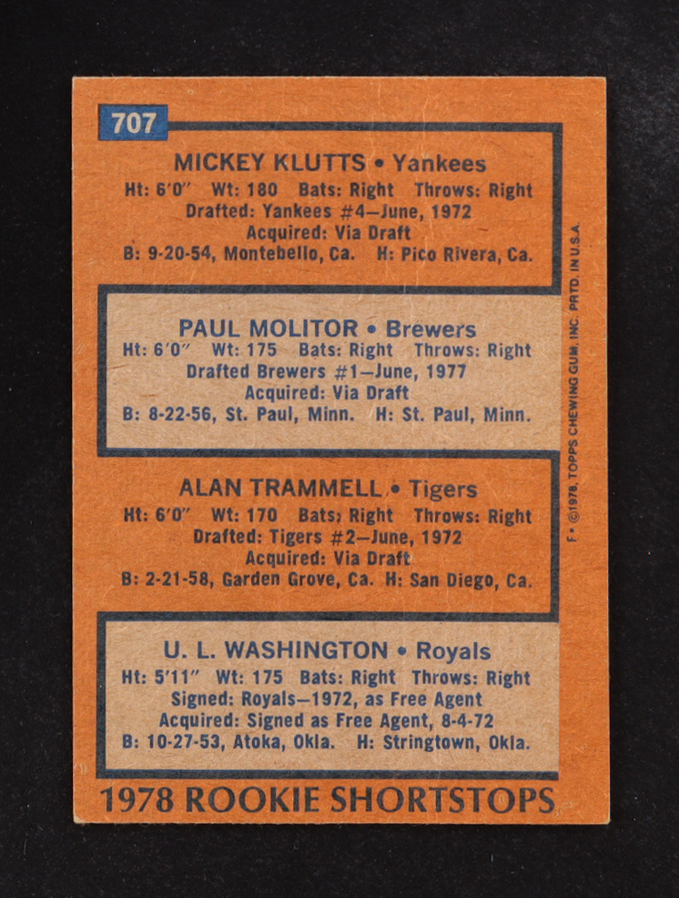 Mickey Klutts / Paul Molitor RC / Alan Trammell RC / U.L. Washington 1978 Topps #707 Rookie Shortstops