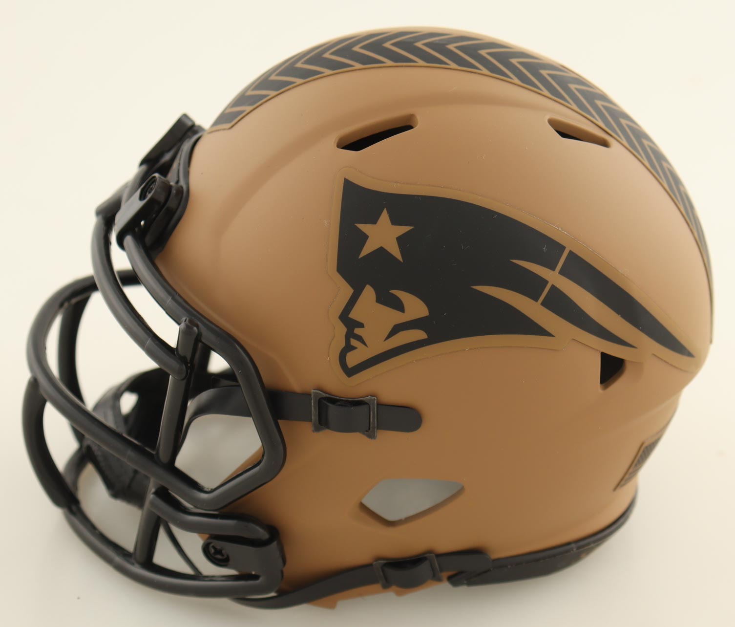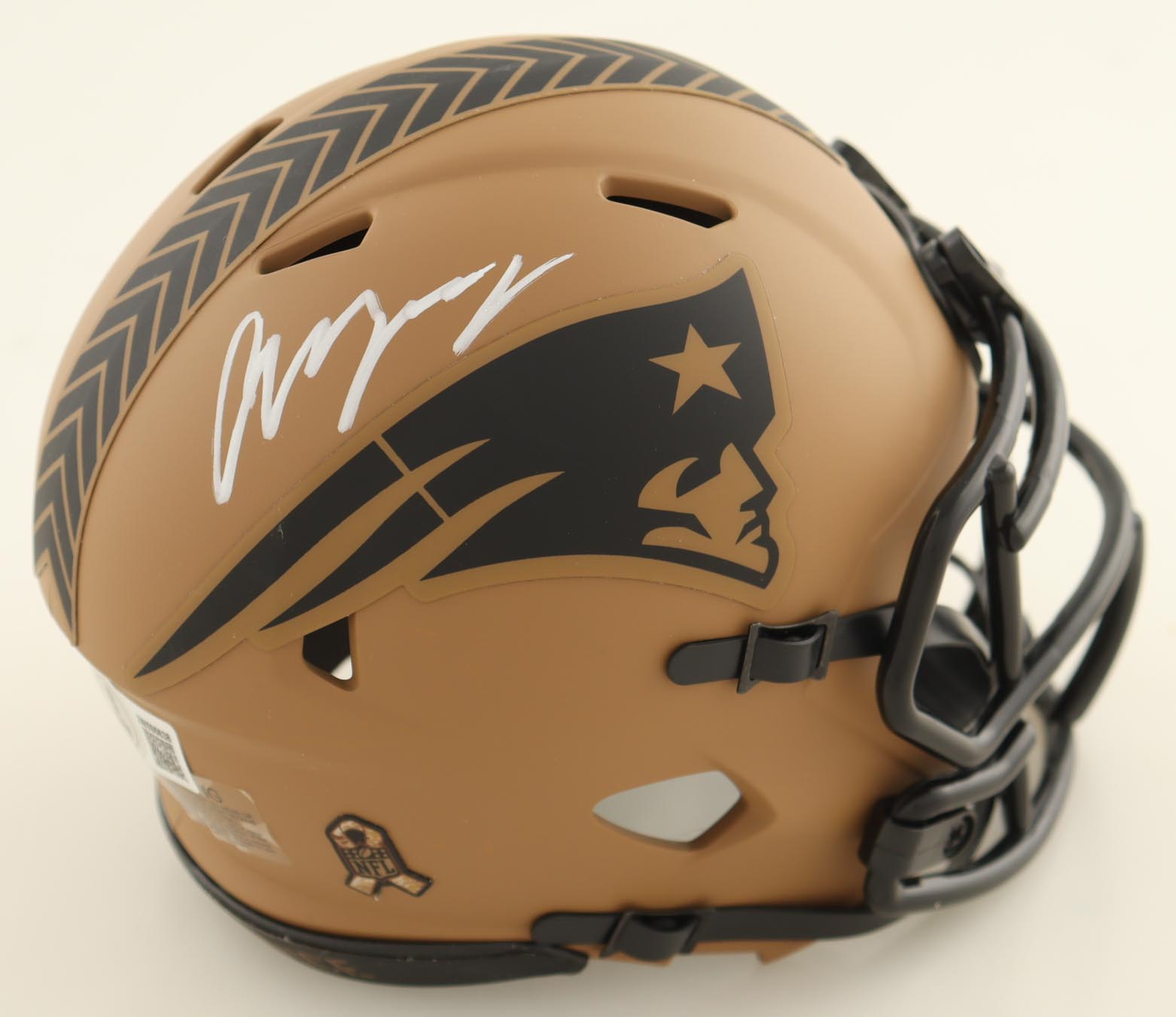 Riddell New England Patriots Salute To Service Speed mini helmet. Hand-signed by Christian Gonzalez.