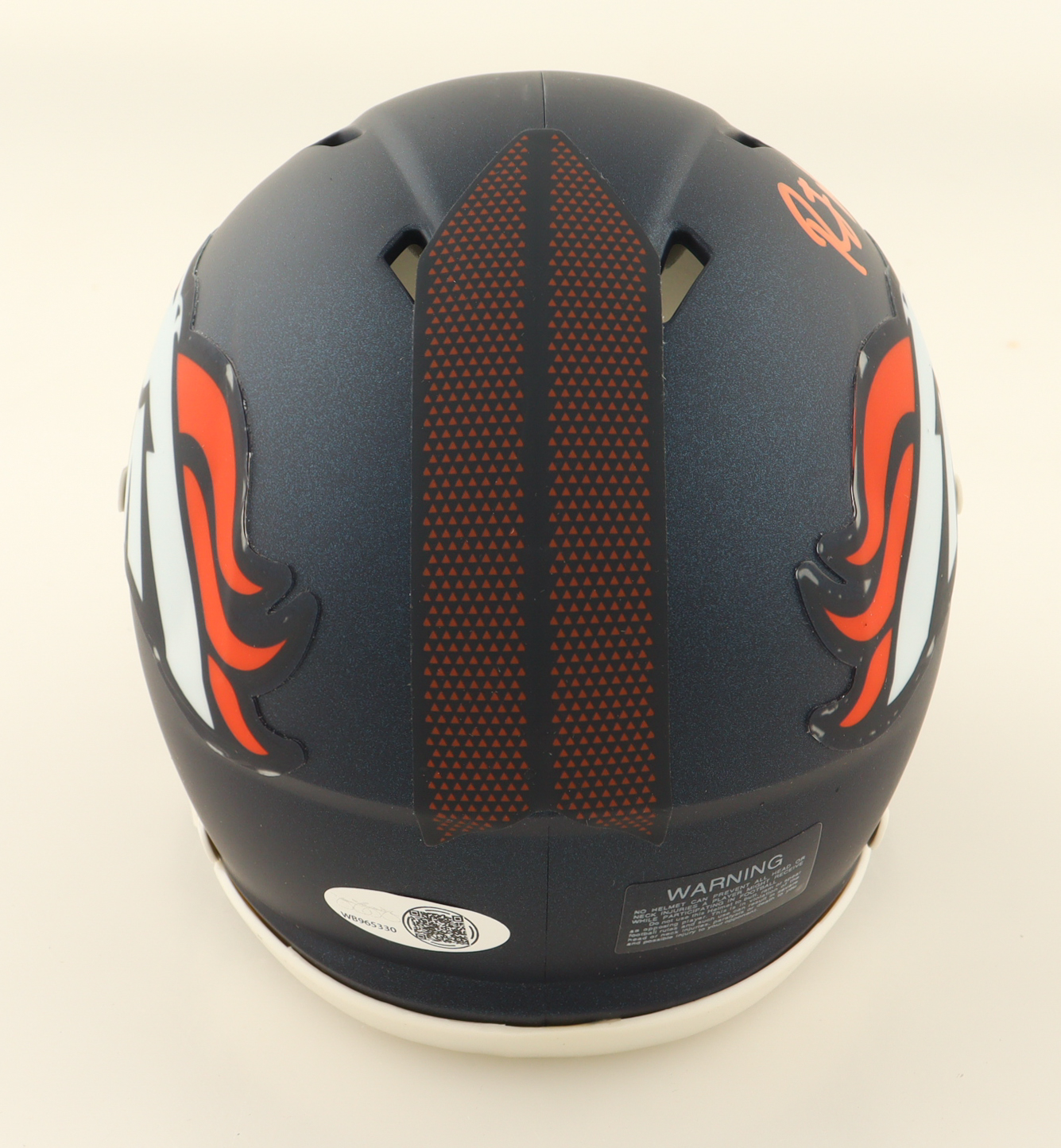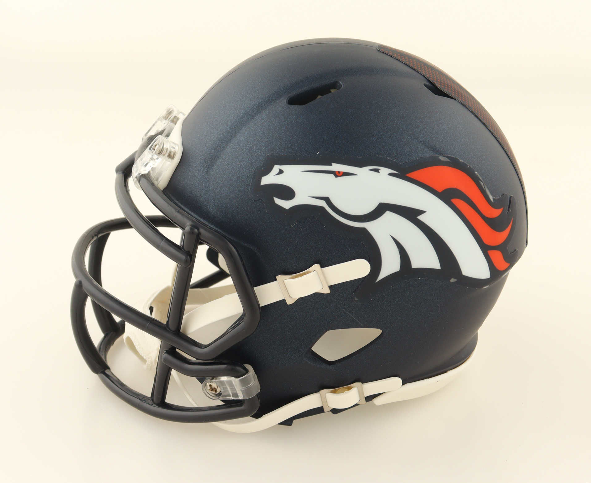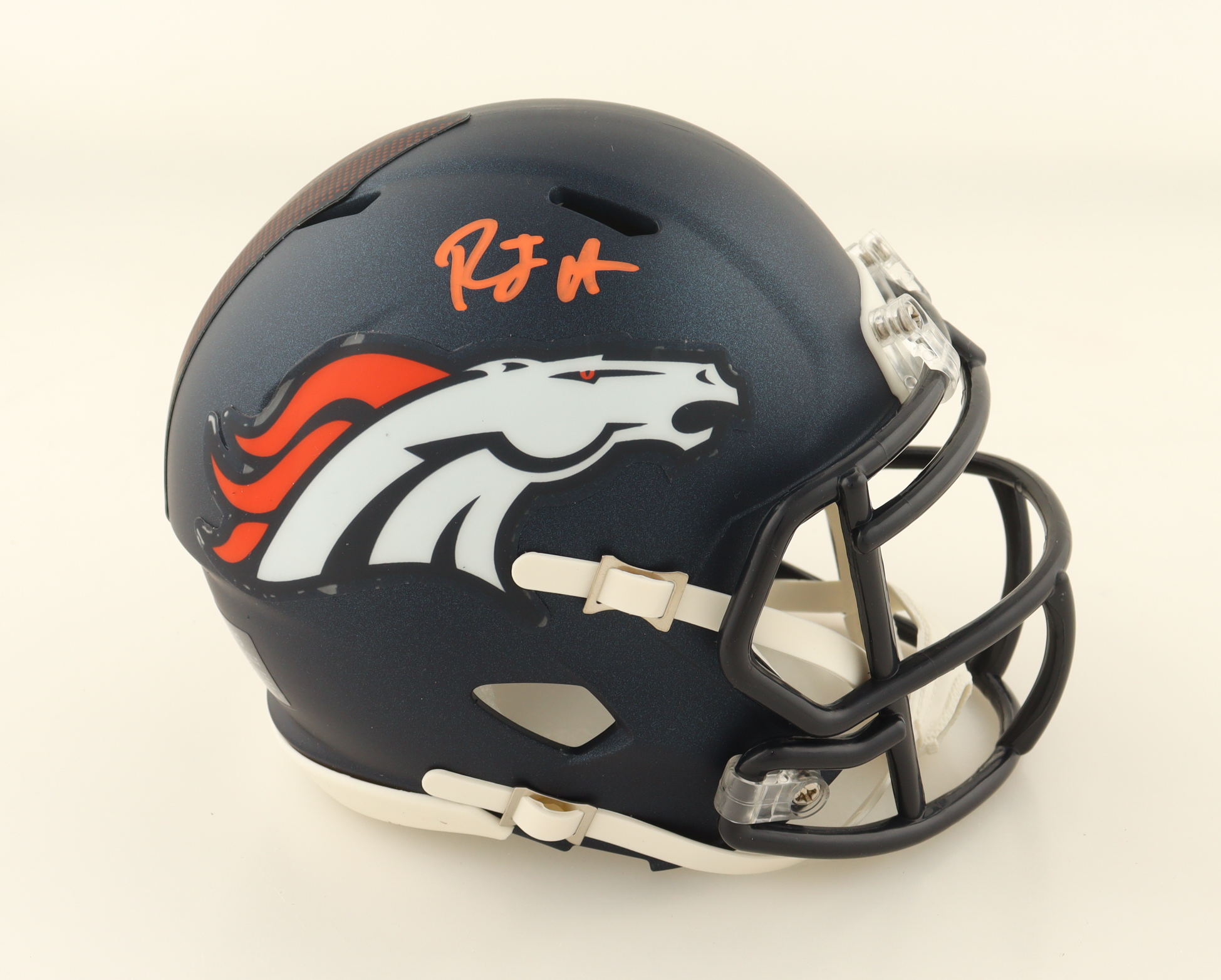 Riddell Denver Broncos speed mini helmet has been hand-signed by RJ Harvey.