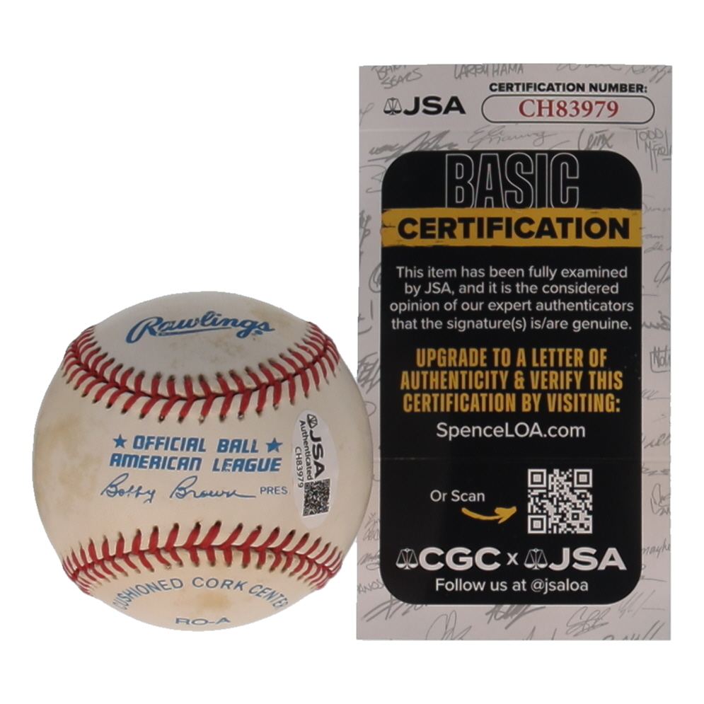 Rawlings Official American League Baseball. Hand-signed by Nolan Ryan (Houston Astros, HOF). Please note, the baseball is naturally toning and stained.