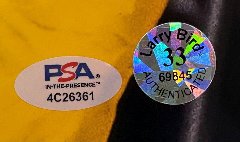 The autograph includes an official PSA/DNA hologram, an official Beckett Authentication Services serially numbered hologram, and an official Larry Bird player hologram for authenticity purposes. The signing of this item was witnessed by PSA.