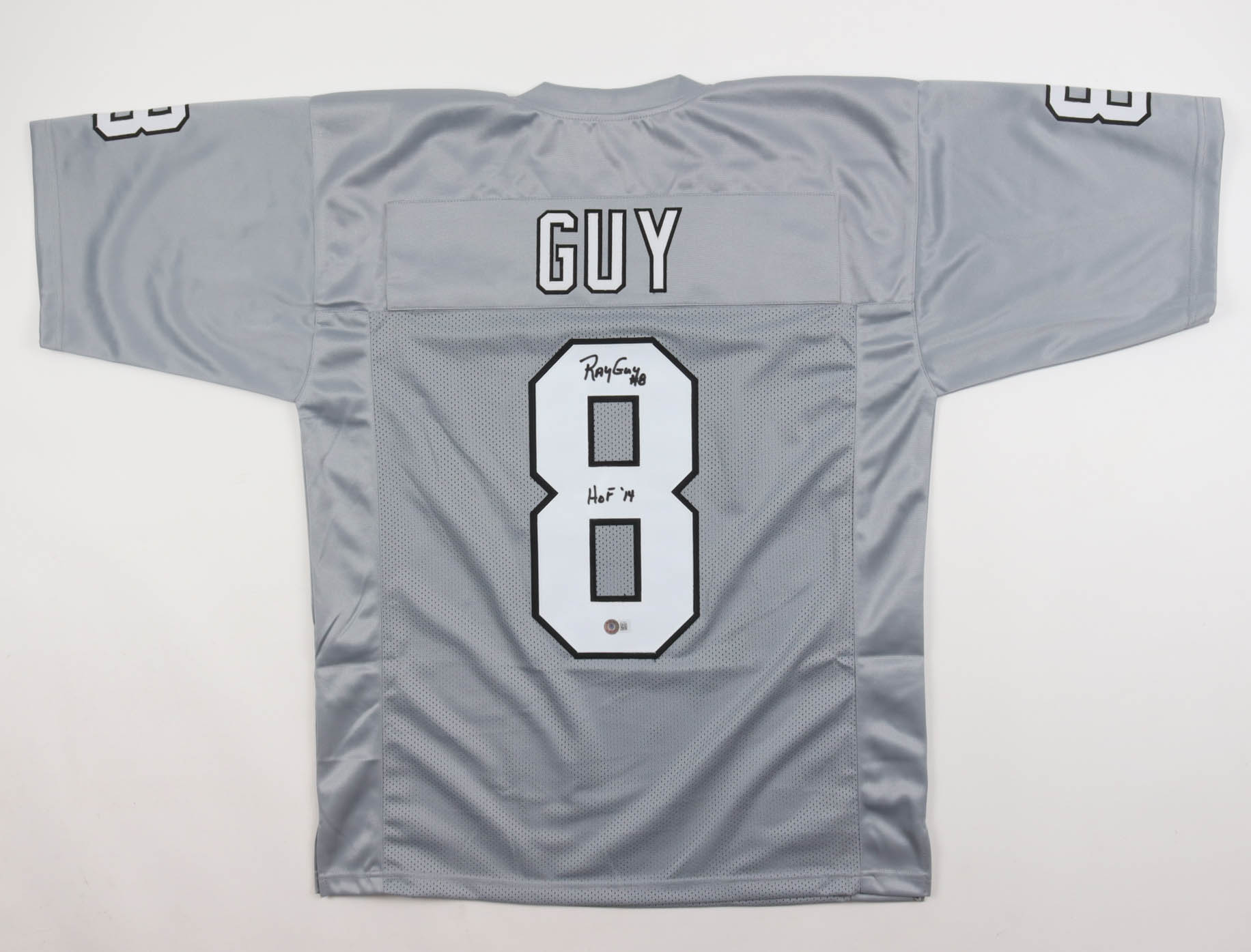 Custom jersey with everything sewn on, size XL. Hand-signed and inscribed by Ray Guy (D. 2022, HOF).