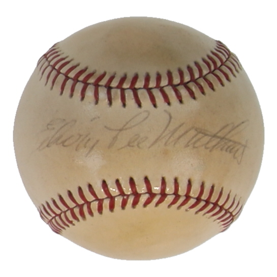 Rawlings Official National League Baseball. Hand-signed by Eddie Mathews (D. 2001, Atlanta Braves, HOF). Please note, the baseball is naturally toned.