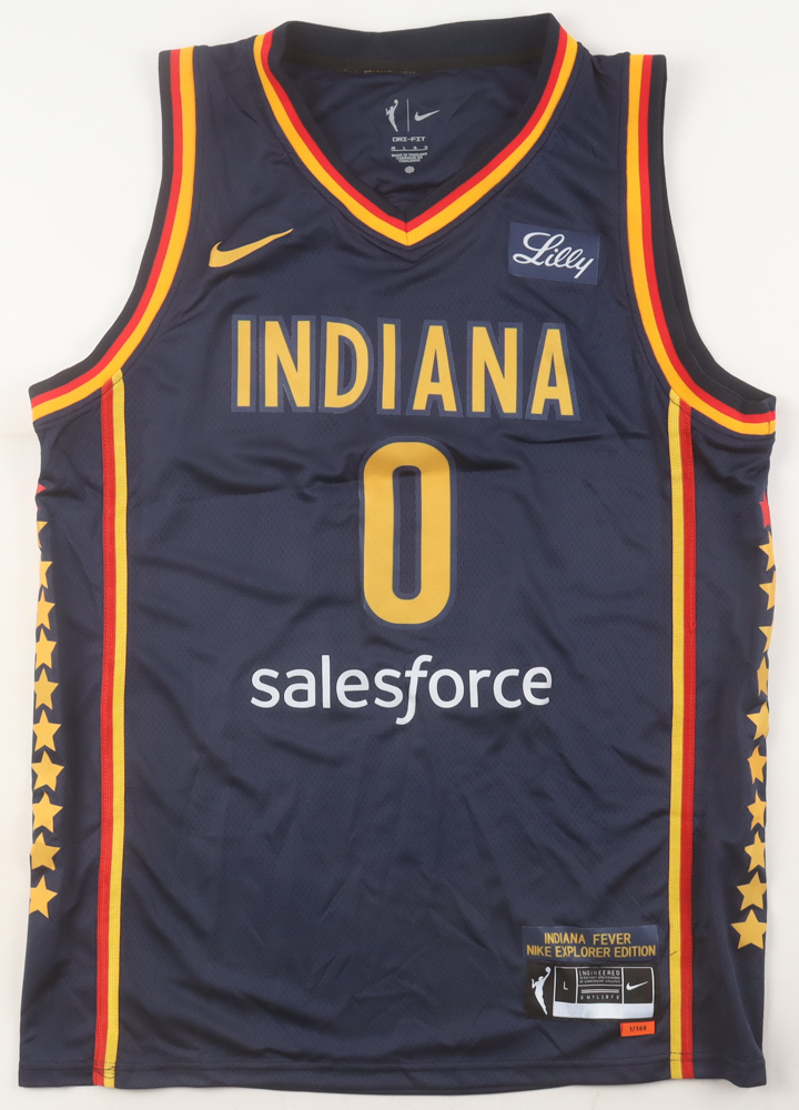 Nike authentic jersey with everything pressed on, size 48. Hand-signed by Kelsey Mitchell (Indiana Fever).