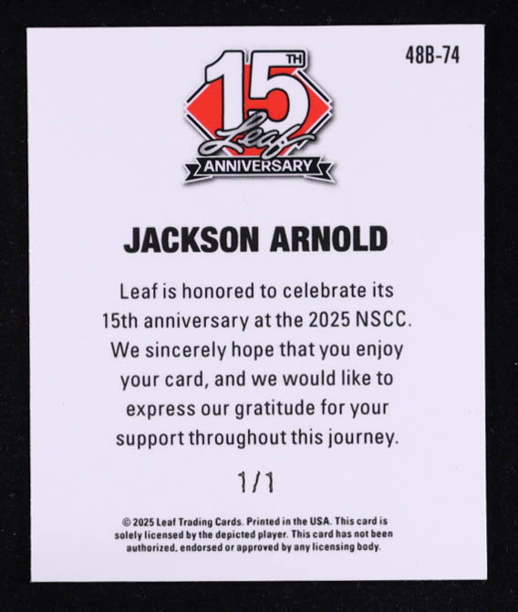 Jackson Arnold 2025 Leaf 15th Anniversary NSCC Super Prismatic Gold #48B74 #1/1