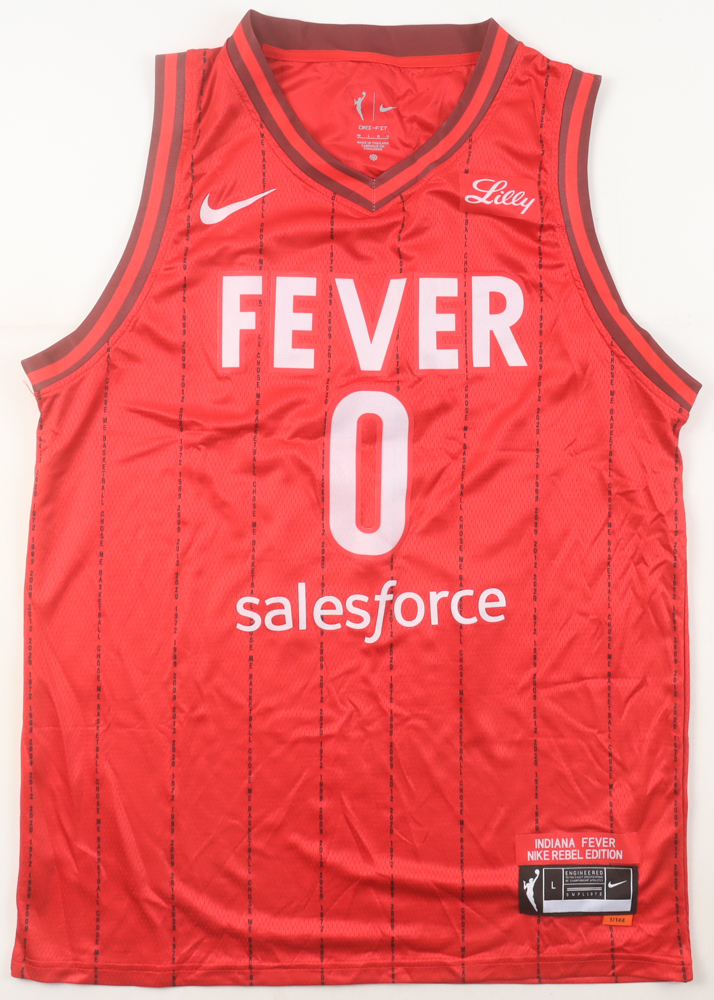 Nike authentic jersey with everything pressed on, size L. Hand-signed by Kelsey Mitchell (Indiana Fever).