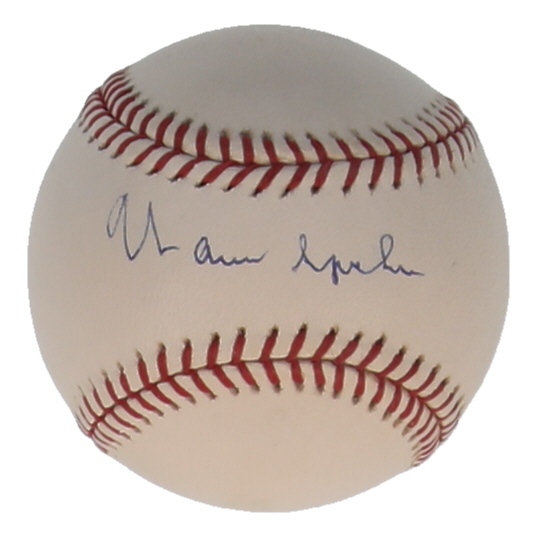Rawlings Official Major League Baseball. Hand-signed by Warren Spahn (D. 2003, Milwaukee Braves, HOF). Please note, there are minor stains throughout the baseball.