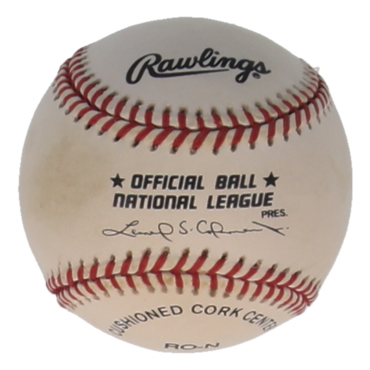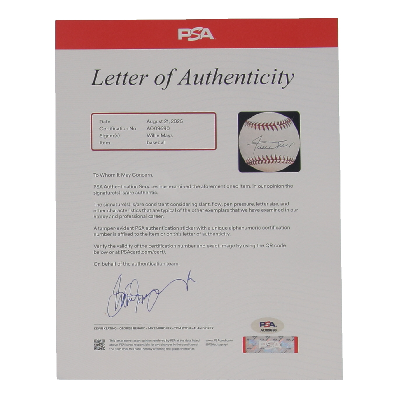 Rawlings Official National League Baseball. Hand-signed by Willie Mays (D. 2024, San Francisco Giants, HOF). Please note, there are stains throughout the baseball.
