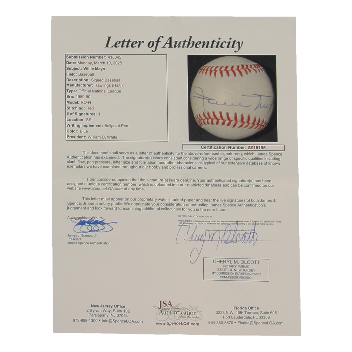 Rawlings Official National League Baseball. Hand-signed by Willie Mays (D. 2024, San Francisco Giants, HOF). Please note, there are stains throughout the baseball.