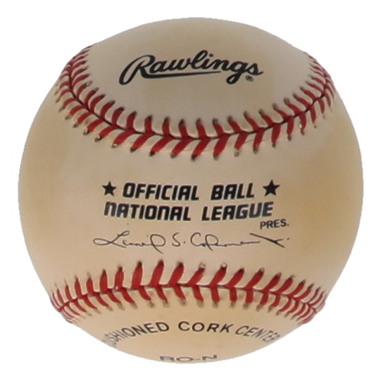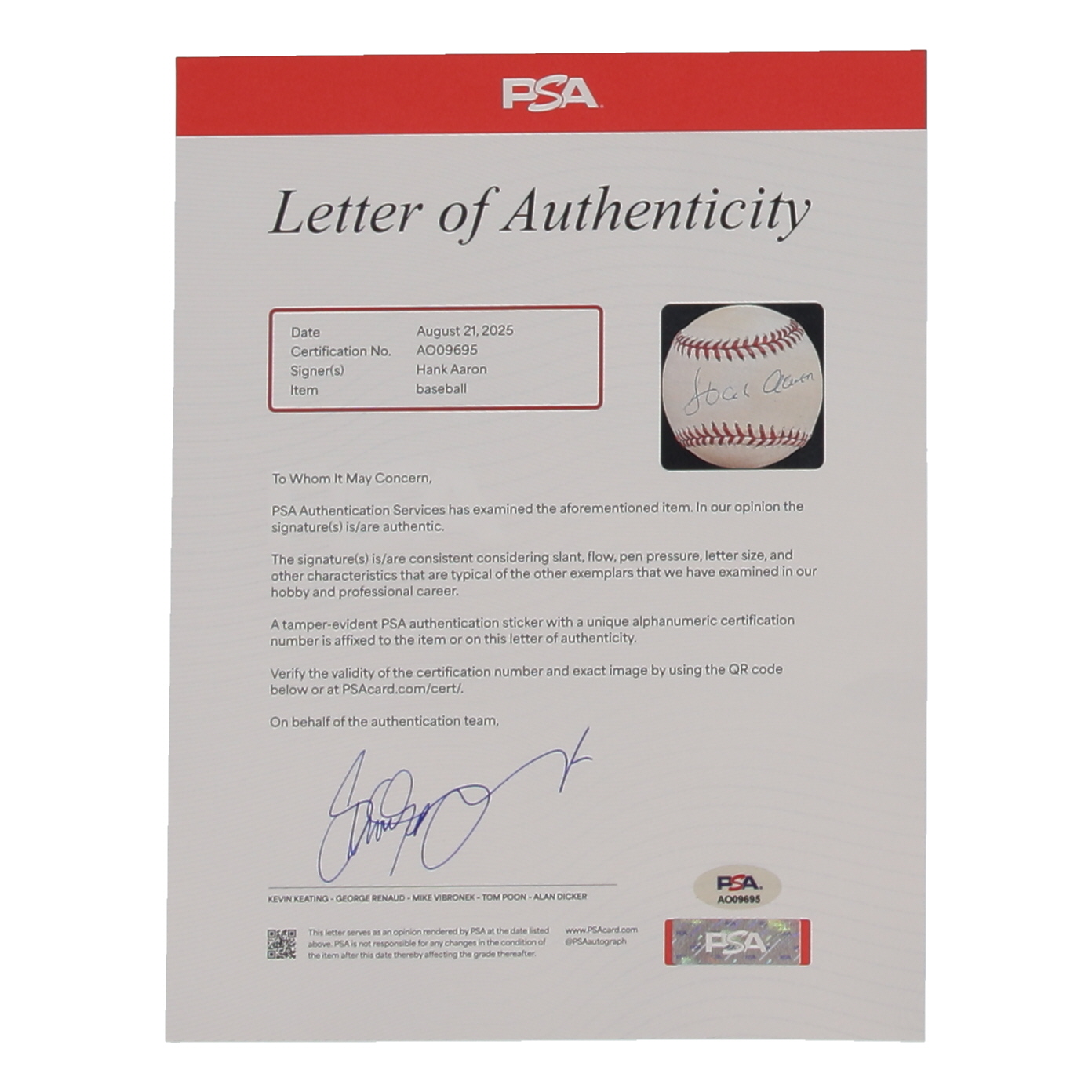 Rawlings Official National League Baseball. Hand-signed by Hank Aaron (D. 2021, Atlanta Braves, HOF). Please note, the baseball is naturally toned and stained.