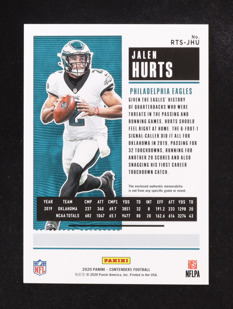 Jalen Hurts 2020 Panini Contenders Rookie Ticket Swatches #22 RC