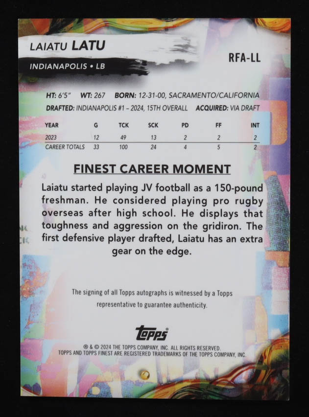 Laiatu Latu 2024 Finest Rookie Autographs Gold Refractors #RFALL #15/50 RC