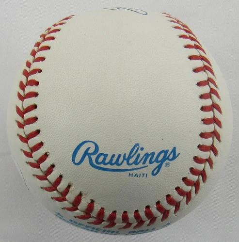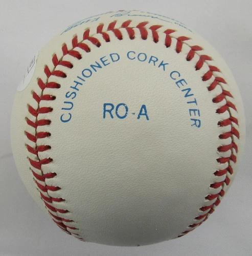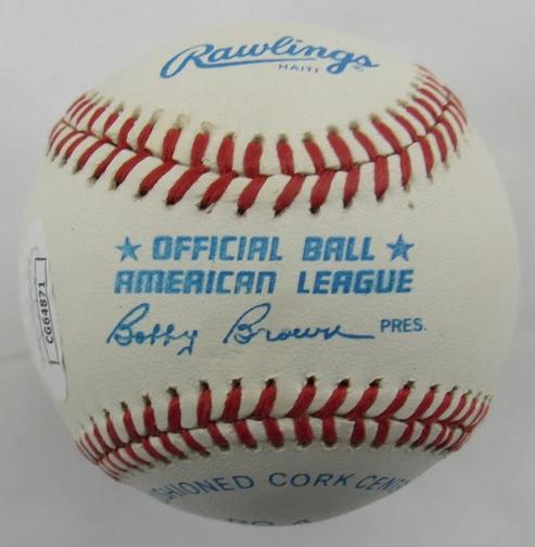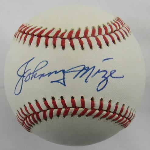 Rawlings Official American League Baseball. Hand-signed by Johnny Mize (D. 1993, St. Louis Cardinals, HOF). Please note, there is natural toning and staining throughout the baseball.