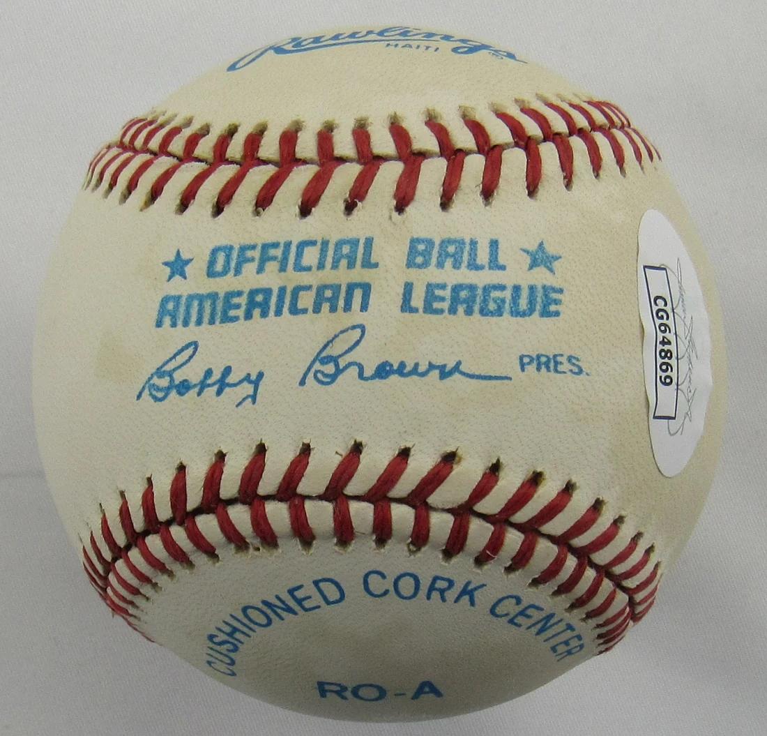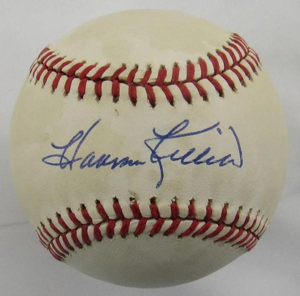 Rawlings Official American League Baseball. Hand-signed by Harmon Killebrew (D. 2011, Houston Astros, HOF). Please note, the baseball is naturally toned and stained throughout.