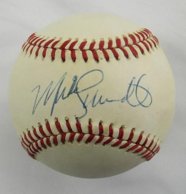 Rawlings Official National League Baseball. Hand-signed by Mike Schmidt (Philadelphia Phillies, HOF). Please note, the baseball is naturally toned and stained.