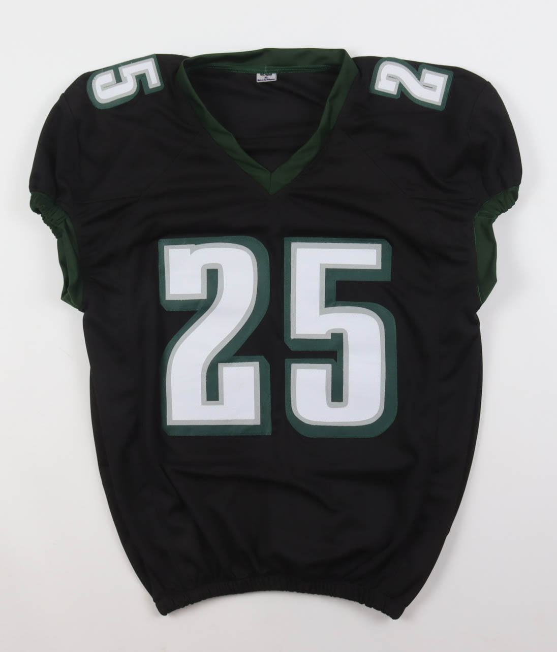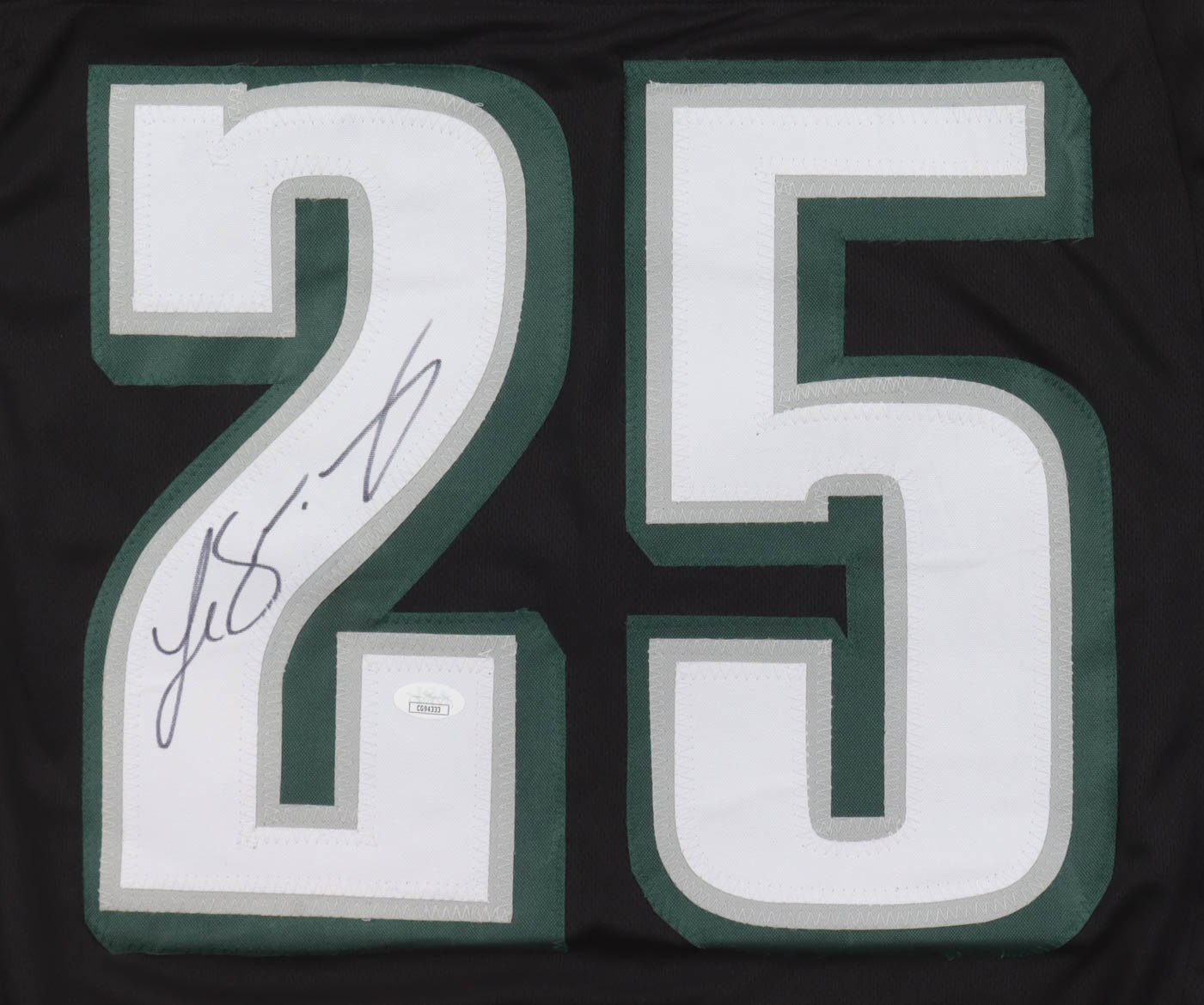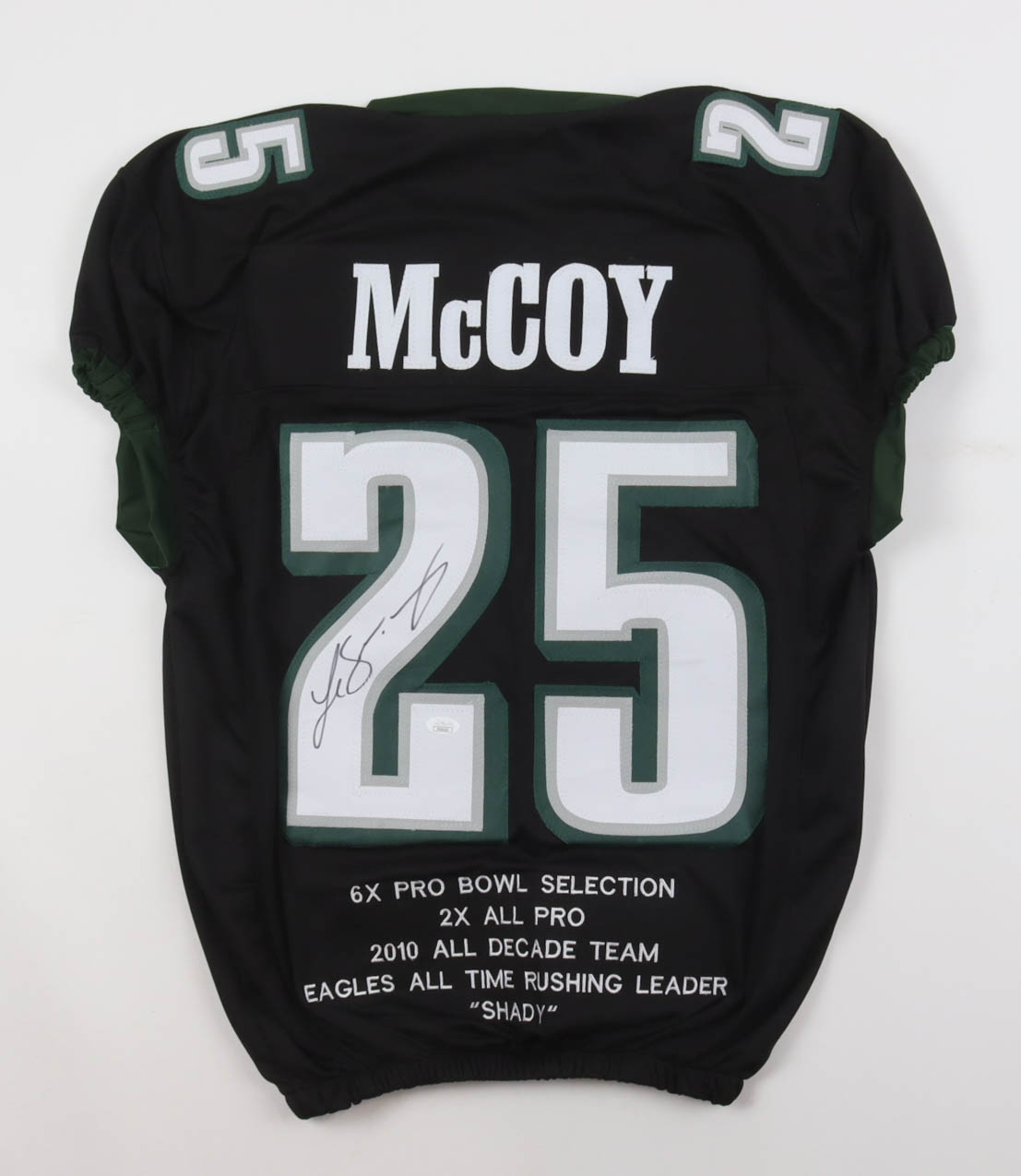 Custom jersey. Everything is sewn on, size XL. Hand-signed by LeSean McCoy. McCoy's career highlights have been custom stitched onto the back of the jersey below the reverse numbers.