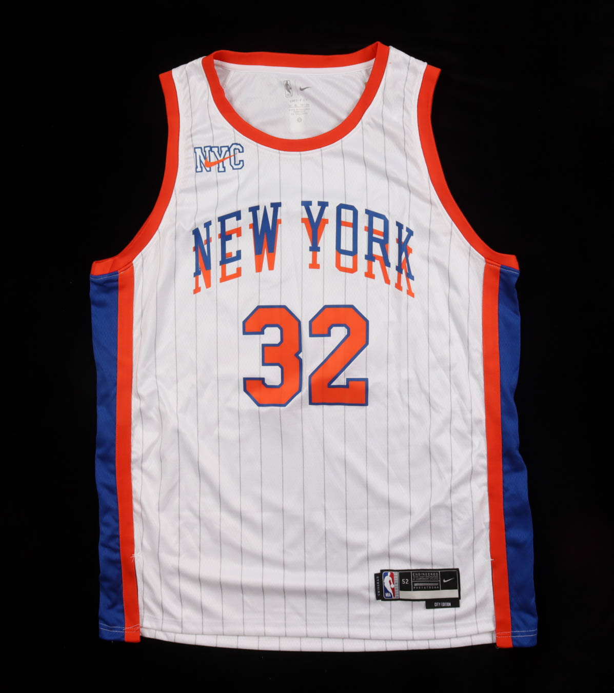 Nike authentic jersey with everything pressed on, size 52. Hand-signed by Karl-Anthony Towns (New York Knicks). Please note, there is a stray pen mark next to the signature.