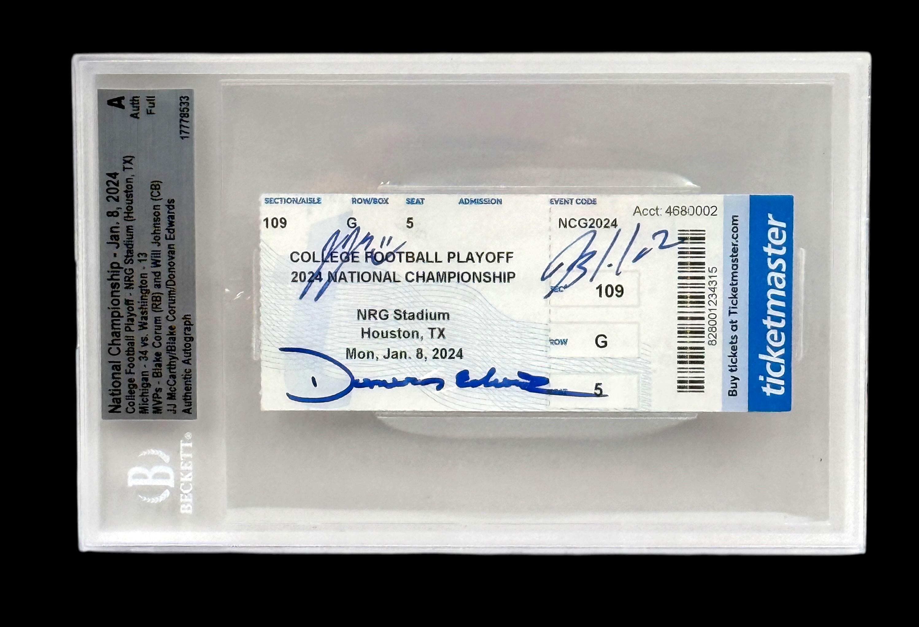 January 8th, 2024 National Championship Game Ticket has been hand-signed by JJ McCarthy, Blake Corum and Donovan Edwards (Michigan Wolverines).