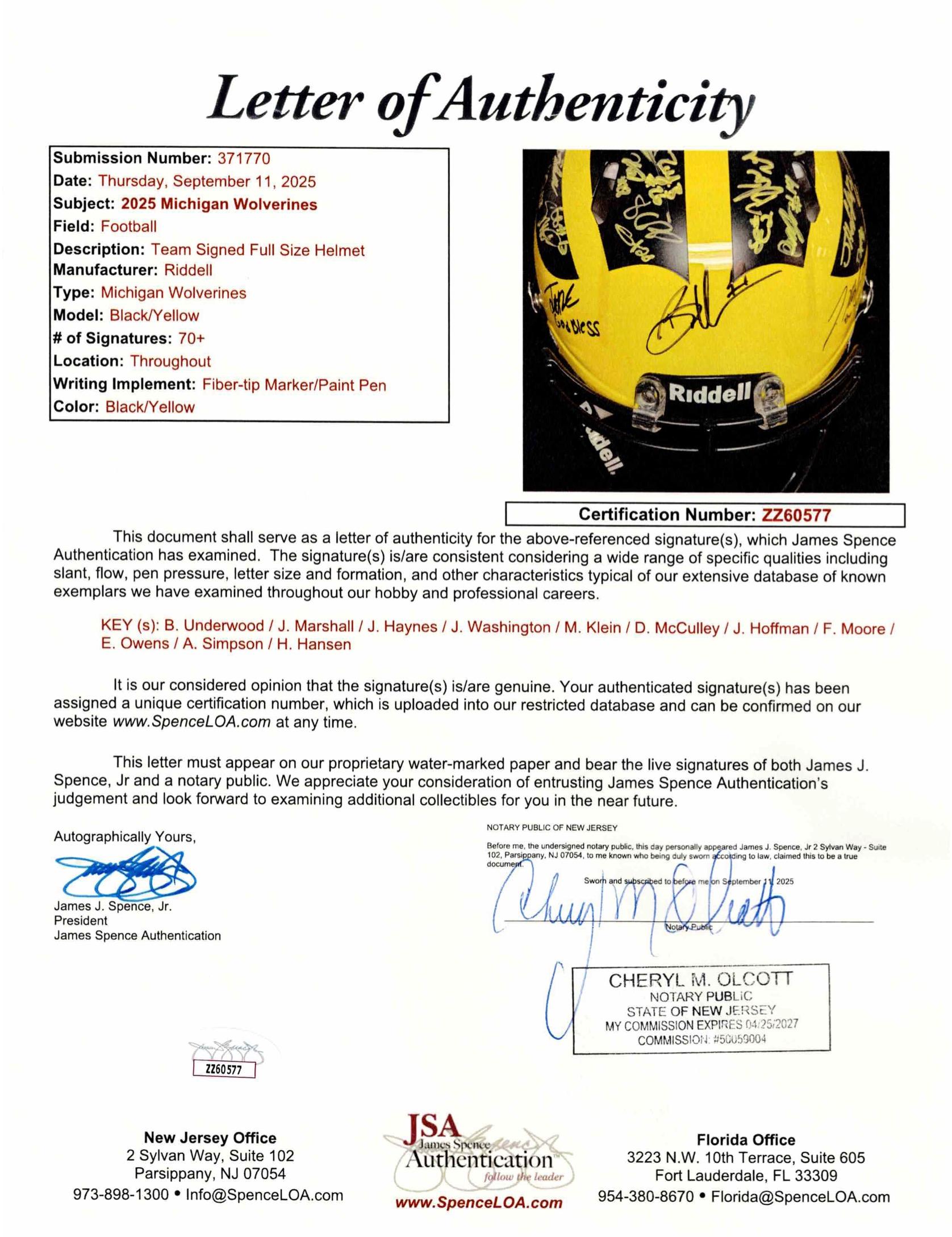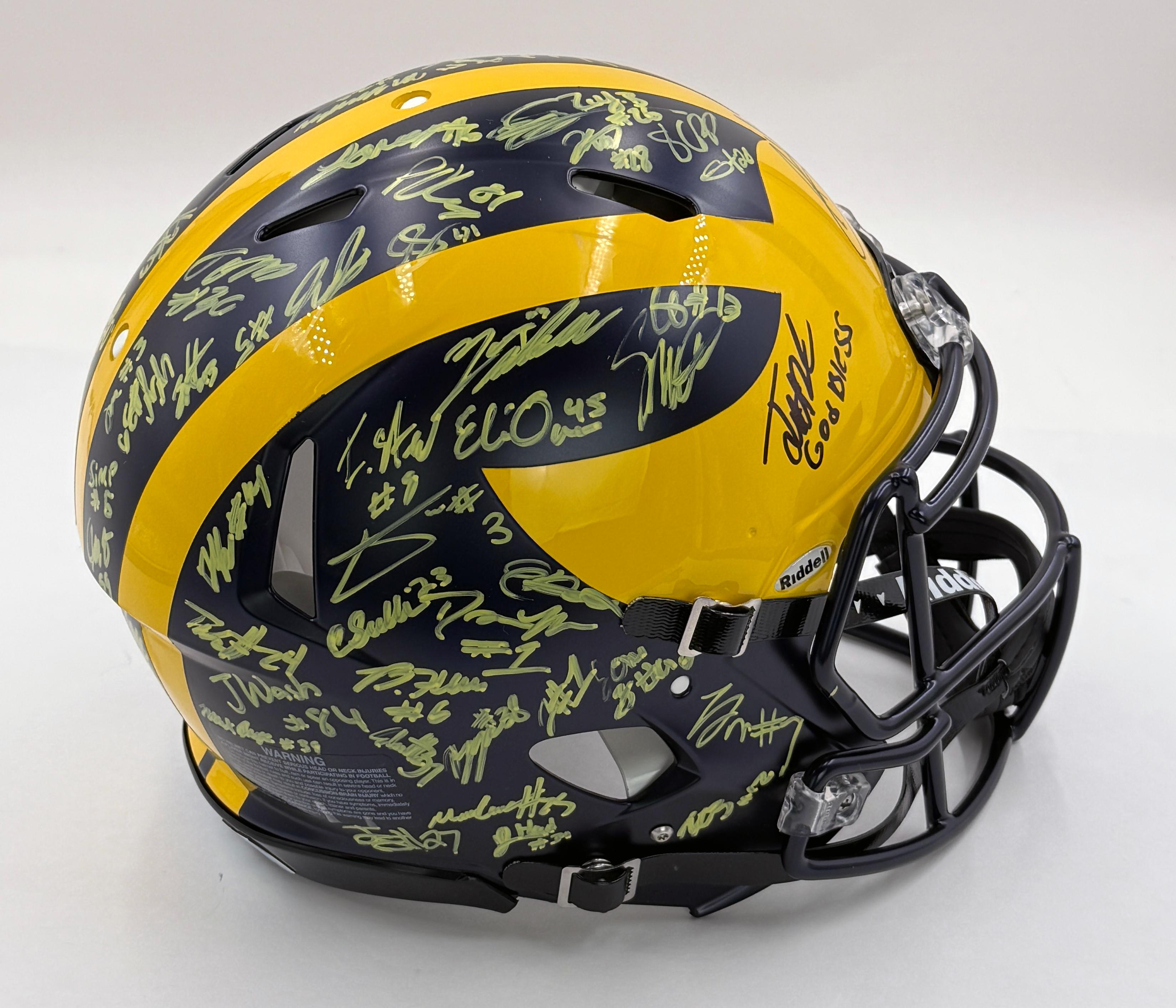Riddell Michigan Wolverines full-size authentic on-field speed helmet has been hand-signed by (70+) members from the 2025 team including Bryce Underwood, Jordan Marshall, Justice Haynes, Jacob Washington, Marlin Klein, Donaven McCulley, Jalen Hoffman, Fredrick Moore, Eli Owens, Anthony Simpson, and Hogan Hansen.